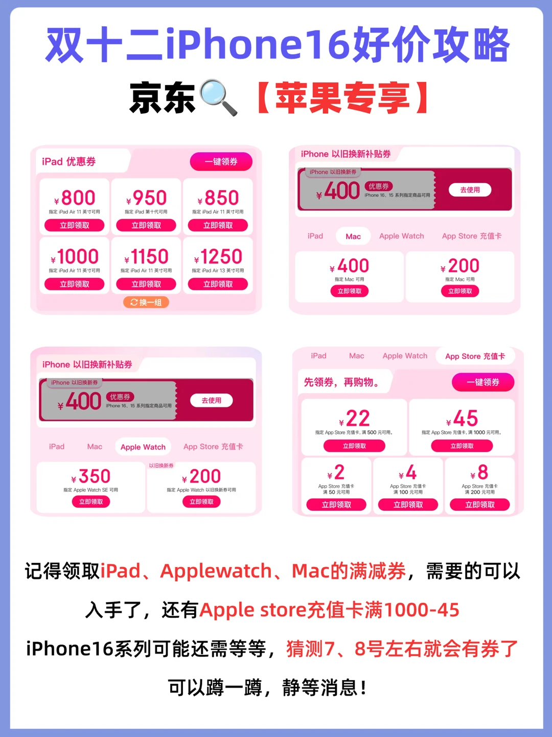 现在iPad、Applewatch、Mac已经有满减券了,还有Applestore充值卡满1000-45,这个喜欢在苹果生态订阅各种服务的友友可以入手;至高优惠10%,1000的充值卡950就可以到手,还是挺划算的,iPhone16/15系列的话还需蹲一蹲,有消息会马上更新滴~