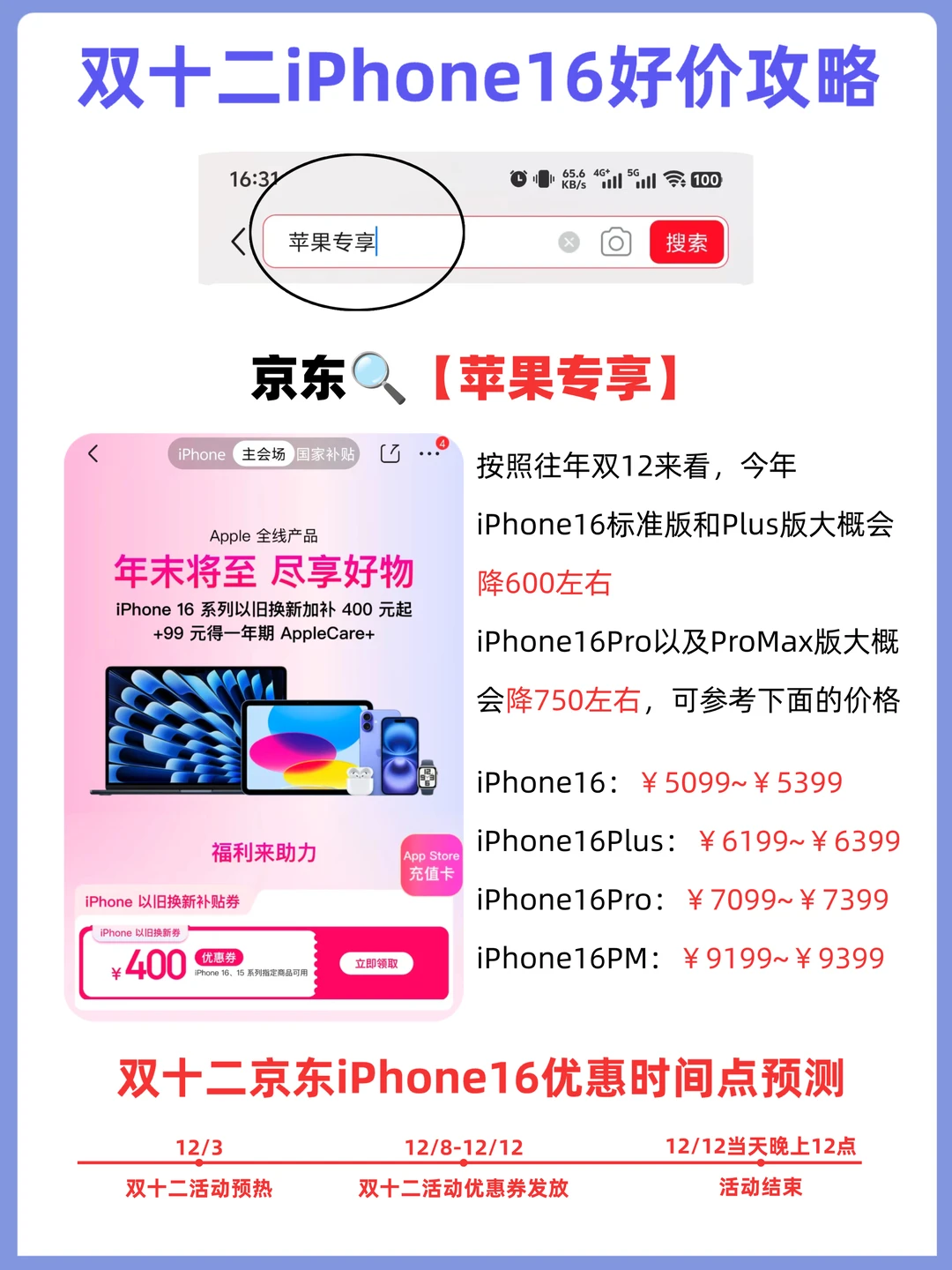 ⏱根据去年时间来看,现在这个阶段属于在预热了,正式开启时间可能在8号左右,结束时间的话在12号当晚12点的样子,预测今年iPhone16标准版和plus版会降600左右,Pro和Promax版会降750左右,🉑参考下面的价格👇