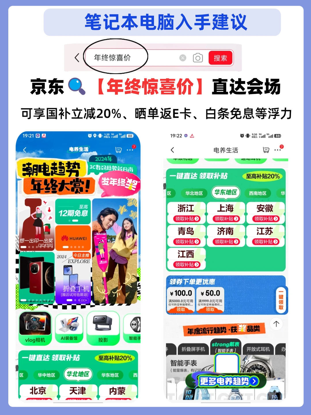 建议去京东🔍【年终惊喜价】直达主会场,会场里面就可选择对应自己所在区域的国补,还可以领取晒单返E卡、白条免息等福利,还是很划算滴