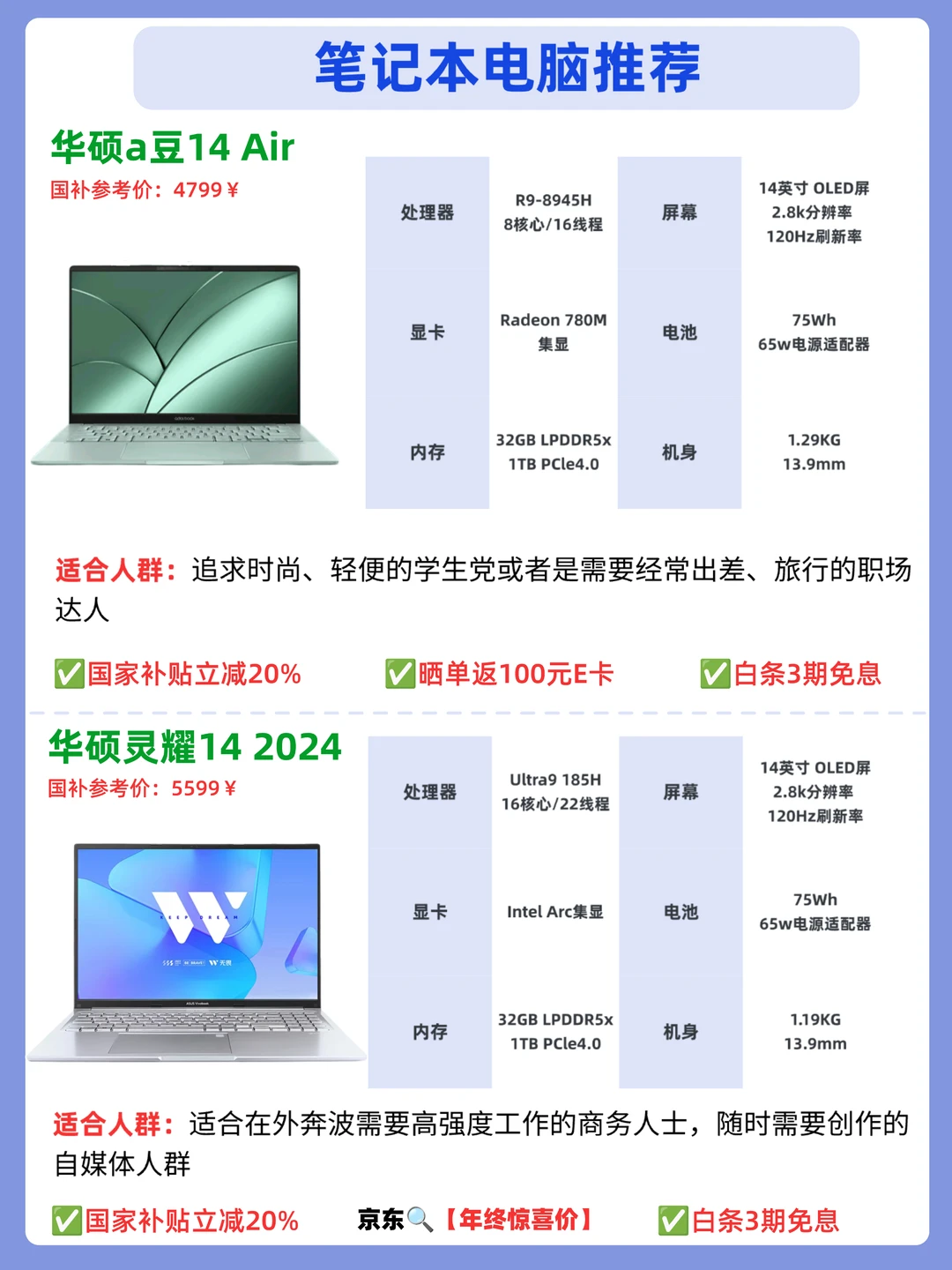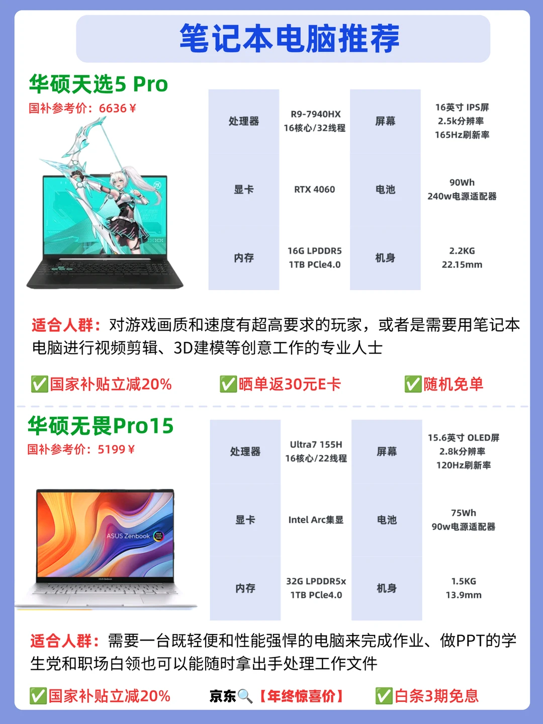 今年马上就要过去啦,想入手笔记本电脑的宝子要抓紧喔,京东🔍【年终惊喜价】,可以国补立减的日子没剩多少天啦,如果不知道怎么选的话,推荐这四款笔记本电脑,都是可以通过国补立减的~还可以叠加京东优惠