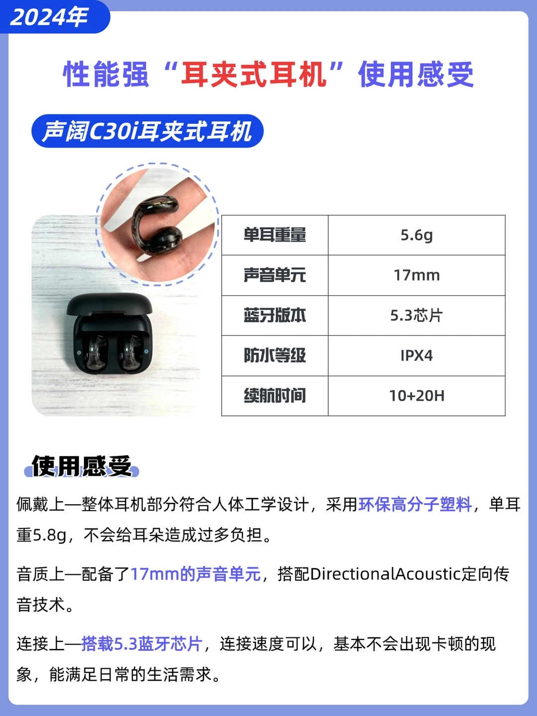 佩戴上—突破性采用BUF环扣人体工学设计,搭配C-Hook2.0的全新佩戴方案,耳机仅5.1g重量,亲肤硅胶柔和贴合耳廓!