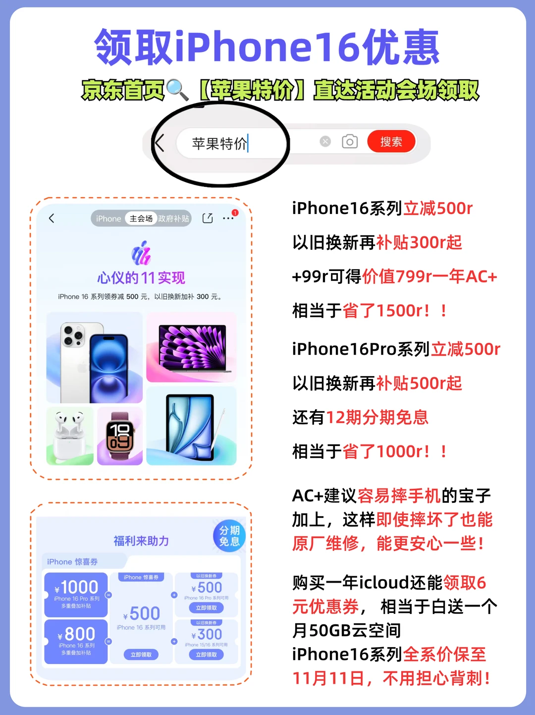 1⃣iPhone16系列:立减500r+以旧换新补贴300r起+99r可得价值799r的一年AC+,一共相当于省了1500r!