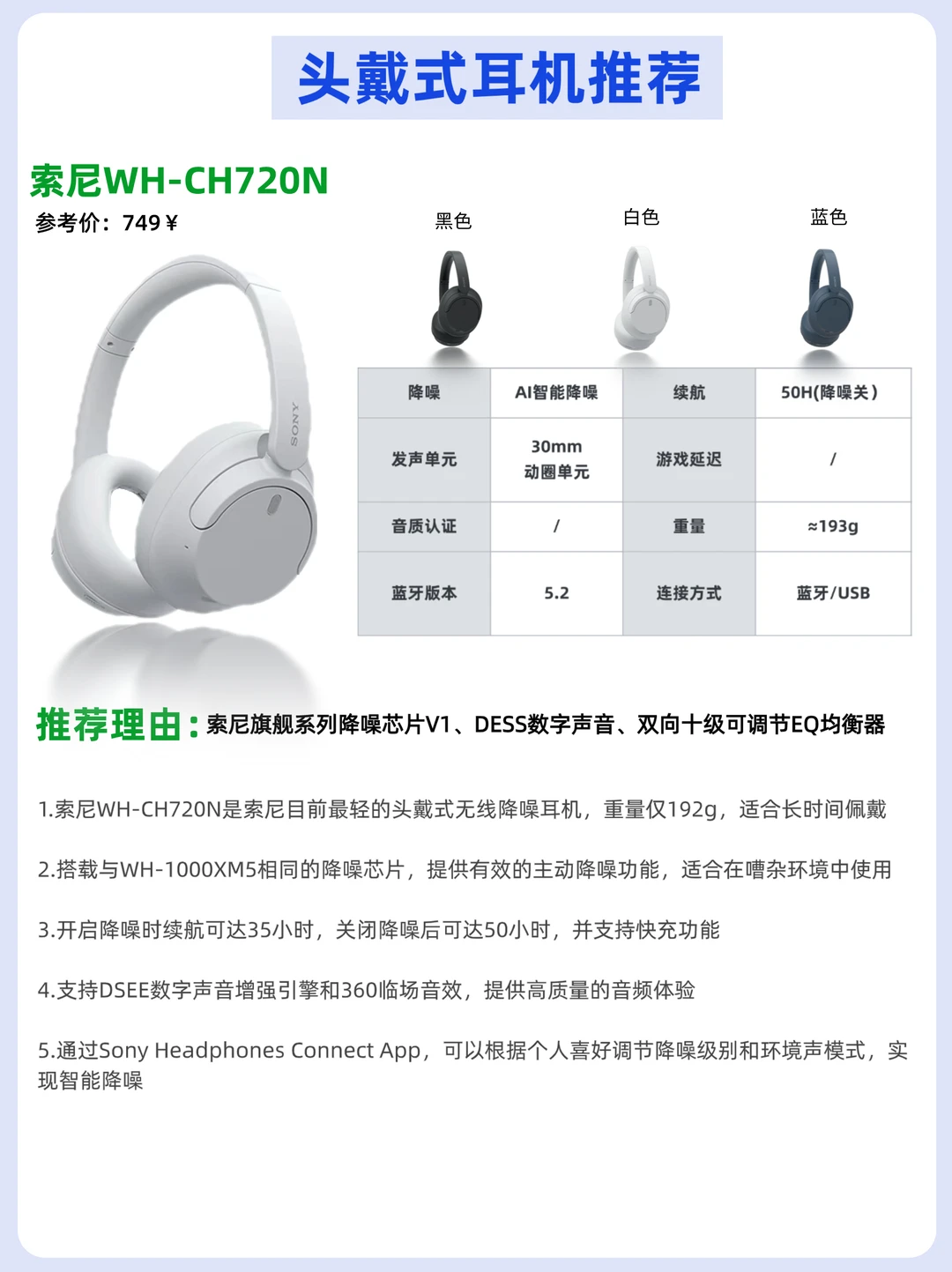 2⃣索尼WH-CH720N(749💰)