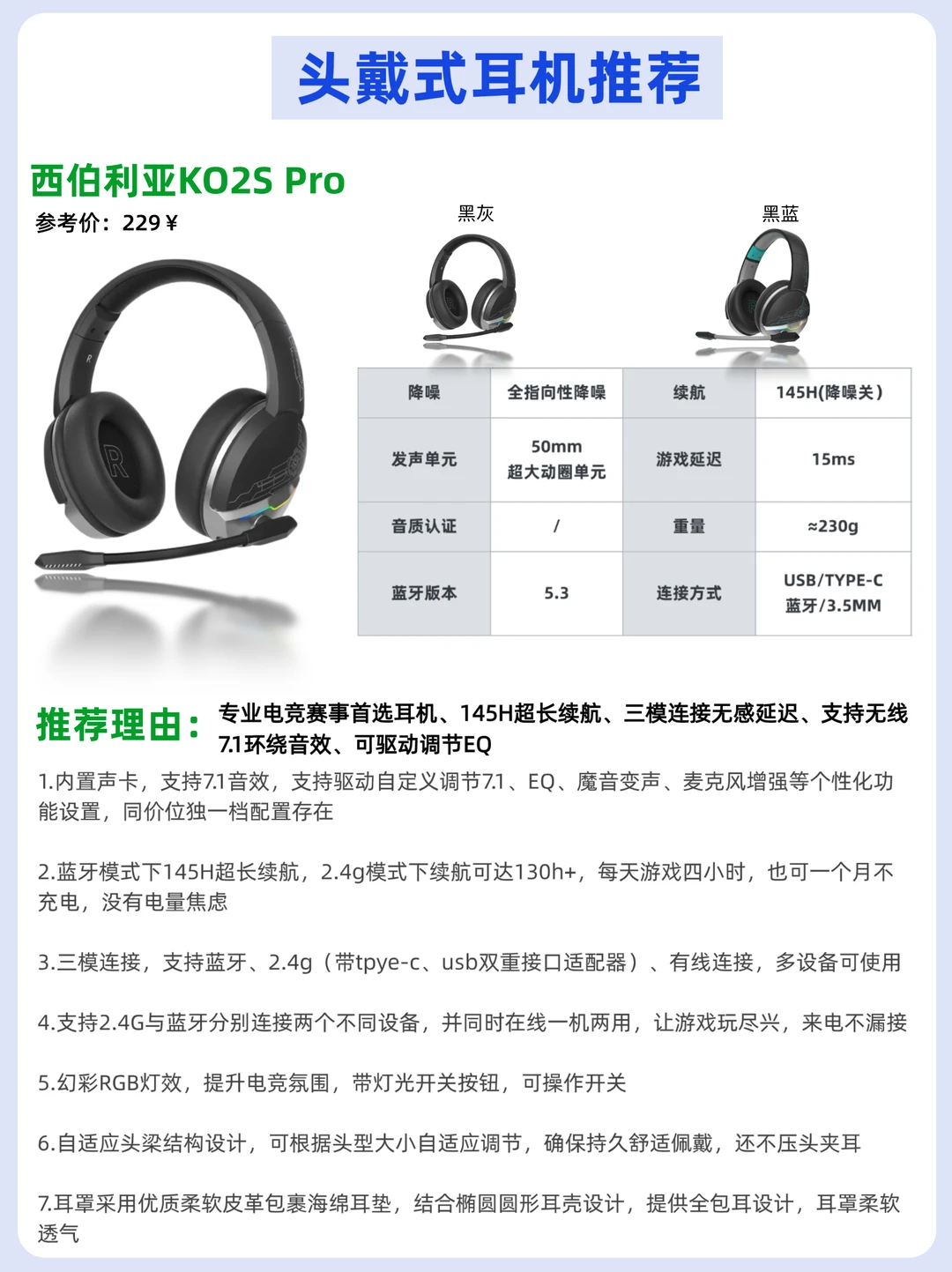 常年销量霸榜!专业电竞赛事首选耳机!游戏延迟低至15ms,配置上50mm超大驱动单元,这个价位独有的7.1环绕音效和支持自定义调节的驱动,还有三种连接模式,采用全包耳设计,柔软透气,续航上可达145小时另外还有炫酷的RGB灯效!总得来看在各方面表现都很出色,且价格平价,电竞玩家首选!