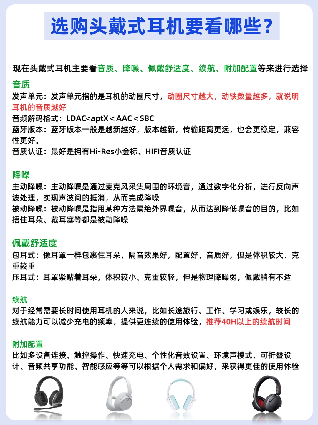 选择头戴式耳机时,可以从音质、降噪效果、佩戴舒适度、续航能力和附加功能等方面进行考虑