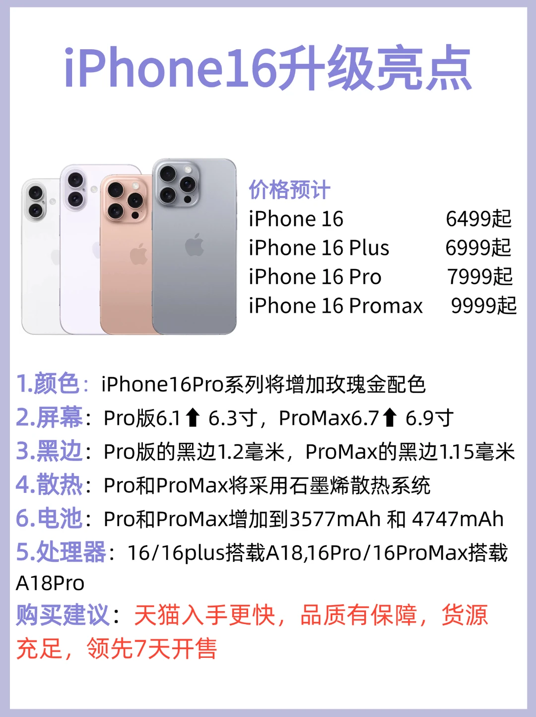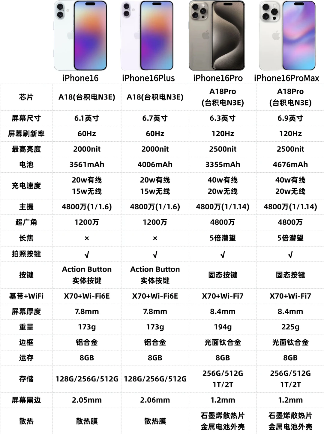 5.处理器:16/16plus搭载A18,16Pro/16ProMax搭载A18Pro