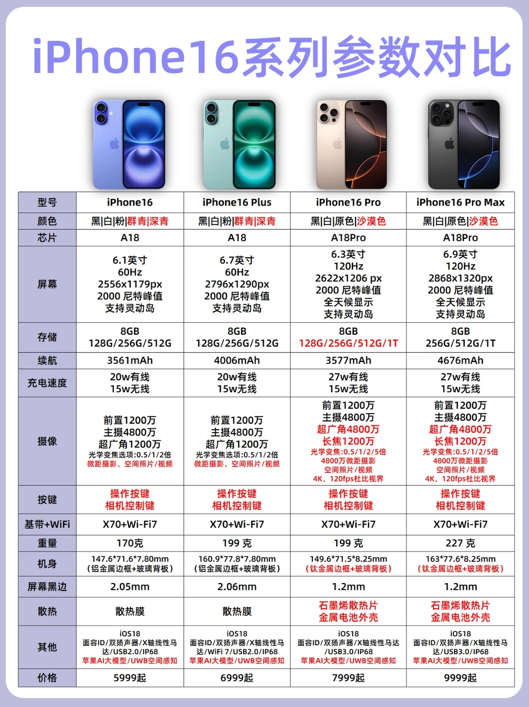 追求高刷的和对拍照体验很强的可以考虑这两款,A18Pro的性能嘎嘎强的,适合预算充足的宝子,拍照两者都一样,想要大屏续航长选ProMax[赞R]