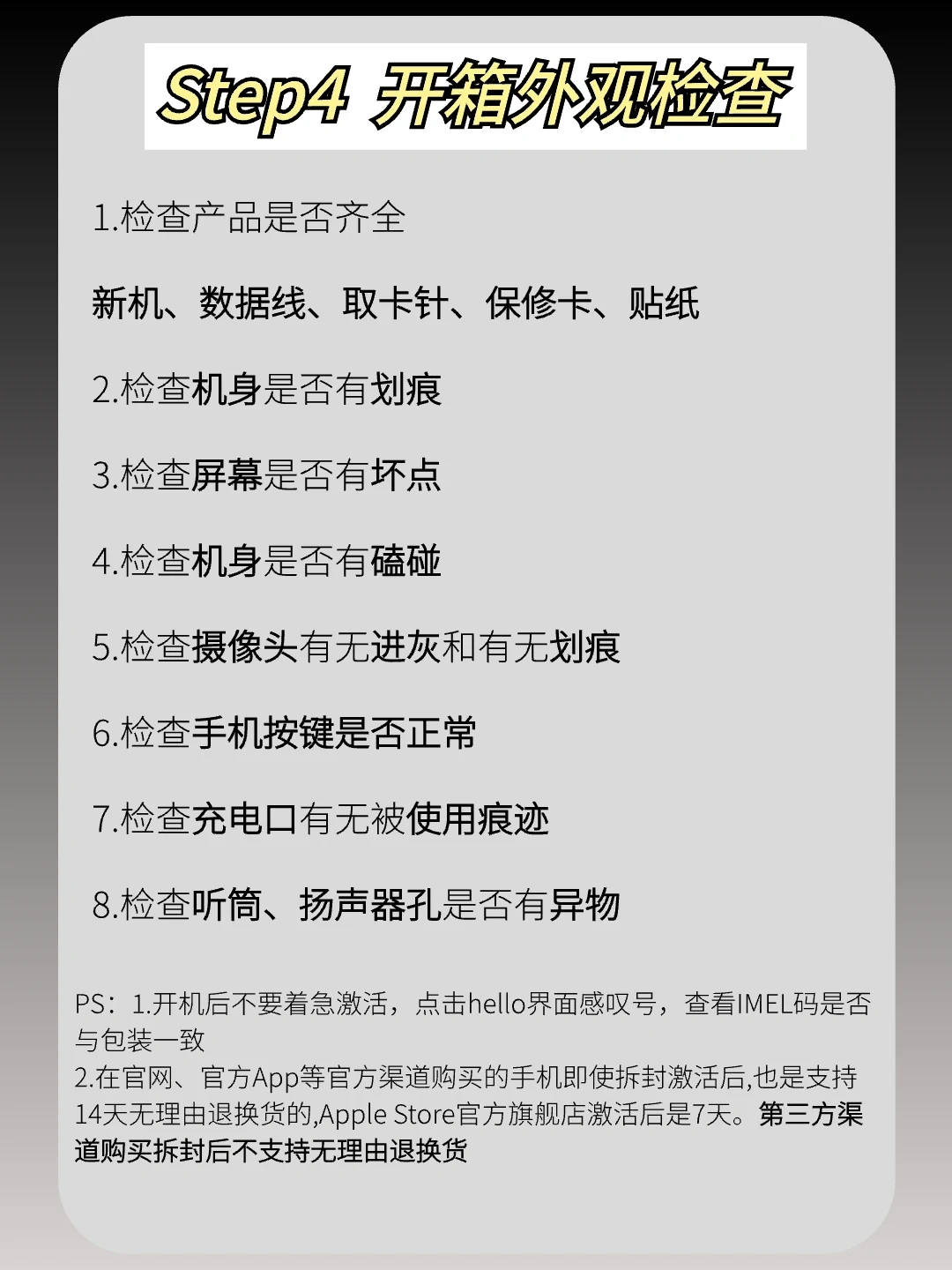 1.查看产品是否齐全:新机、数据线、保修卡、取卡针、贴纸