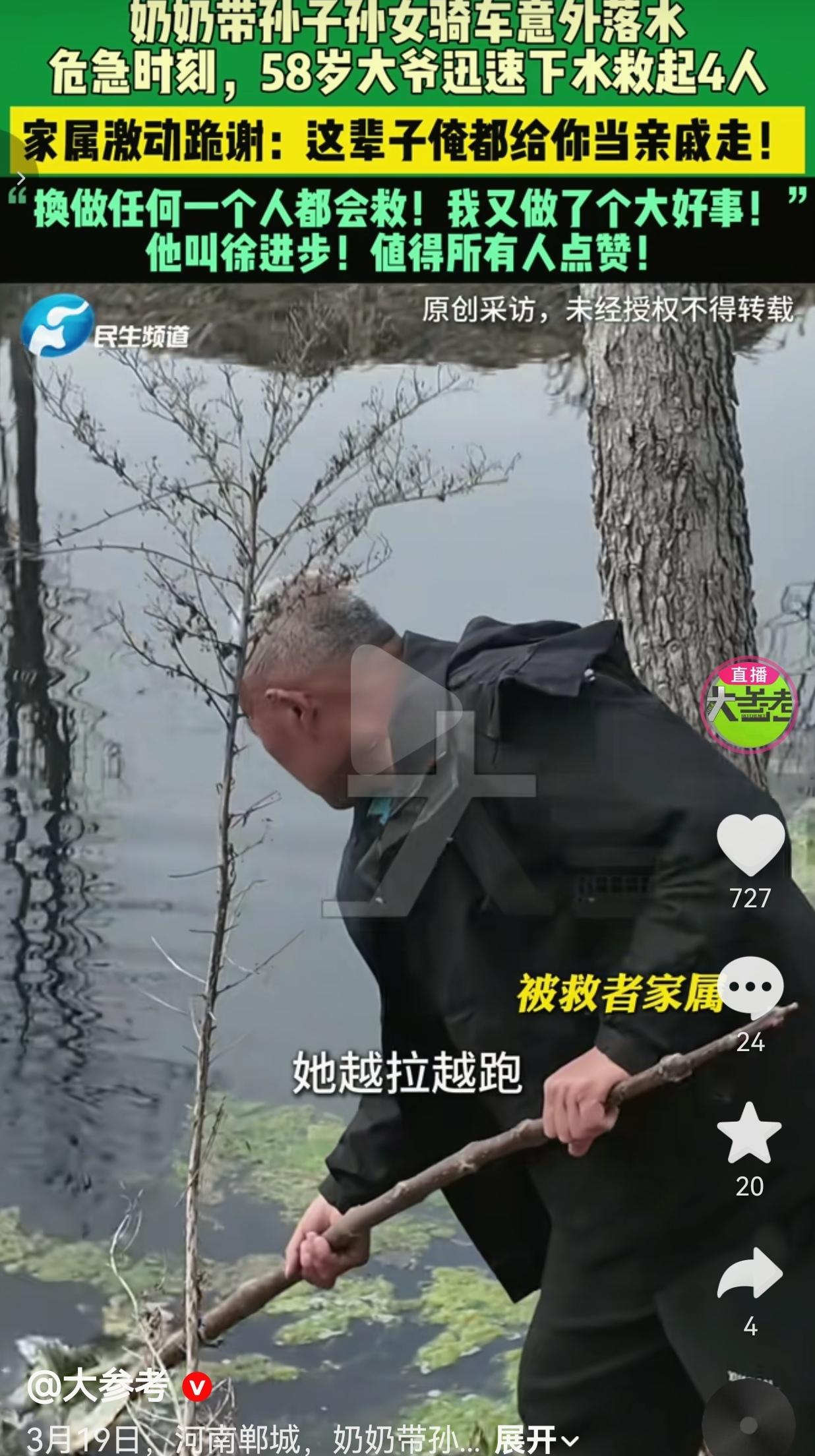 58岁大爷跳7米深水救4人!家属跪谢:这辈子俺都当亲戚走!这才是中国人的脊梁! 谁再说现在好人少?河南郸城这位58岁大爷,用命给所有人上了一课! 3月19日,河南郸城,一位奶奶带着三个孙子孙女骑车上街,车子突然失控冲进河里!水深足足7-8米,奶奶和两个孩子瞬间被冲到河中央,另一个小女孩拼尽全力才爬到岸边,四个人在水里扑腾,命悬一线! 路过的徐进步大爷听见呼救,连衣服都没来得及脱,“扑通”一声就扎进冰冷的河水里!他攥着一根长木棍,趟着齐腰深的水往河中央挪,水没过胸口、呛进鼻子,他愣是没退一步!先把漂在最中间的孩子扒拉到岸边,再回头救奶奶和另一个娃,来来回回折腾了十几分钟,硬是把四条人命全拉回了岸上! 事后被救的家属哭着给大爷下跪,捧着锦旗来到大爷家中:“你救了俺一家人!这辈子俺都给你当亲戚走!” 大爷却摆摆手,憨笑着说:“换做任何人都会救!我又做了个大好事!举手之劳!” 网友评论区炸了,有的网友说:啥叫举手之劳?这是拿命换命!58岁了啊!换我下去都得冻僵,大爷这身子骨是铁打的?必须给大爷发奖金! 也有的网友说:“看得我眼泪哗哗流!三个娃啊!要是没大爷,这一家就毁了!现在这种敢冲敢救的人,真的太少了!” 也有的网友说:“那些说“多一事不如少一事”的,看看人家!这才是咱河南爷们!这才是中国人的良心!” 还有的网友说:“大爷说“换做任何人都会救”,可真到事儿上,敢跳下去的有几个?这才是最朴素的伟大!” 我看完这段视频,攥着手机的手都在抖!什么叫平凡中的伟大?这就是!58岁,本该是在家含饴弄孙的年纪,他却敢往7米深的冰水里跳!没有犹豫,没有权衡利弊,只有“必须去救”的本能! 有人总说“人心凉了”“不敢做好事了”,可徐大爷用行动告诉我们:善良从来都没消失,只是藏在每个普通人的骨子里!他不图钱不图名,救完人还说“举手之劳”,这份纯粹,比任何网红作秀都动人! 被救家属的下跪,不是卑微,是发自肺腑的感恩;大爷的摆手,不是客套,是刻在骨子里的善良。这才是我们最该追的星,这才是中国最硬的底气! 别怕善良会被辜负,总有人愿意用命,去托住另一个家庭的希望!这,就是我们中国人! 对此,你怎么看?