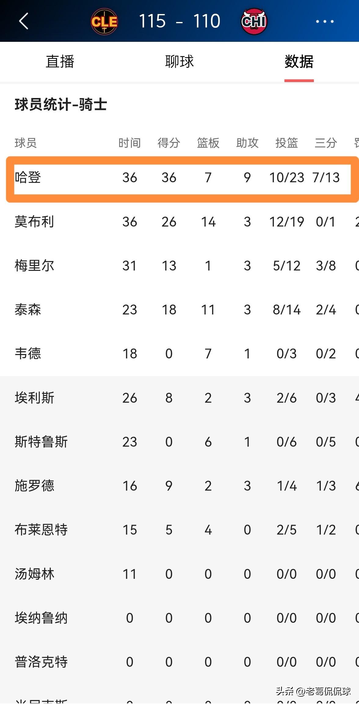 骑士超级球星哈登真是彻底的怒了!在今天骑士客场以115:110力克公牛的比赛中,哈登在进攻端展现出了超强的得分欲望,最终怒砍骑士生涯新高的36分。 整场比赛下来,哈登首发出战36分钟,投篮23中10,其中三分球13中7、罚球11中9爆砍36分,外加7篮板9助攻2抢断1盖帽,他的场上正负值为+9。 事实再次证明,虽然哈登是一名36岁的老将,但是只要哈登想得分,那么他依然能够视得分如探囊取物。