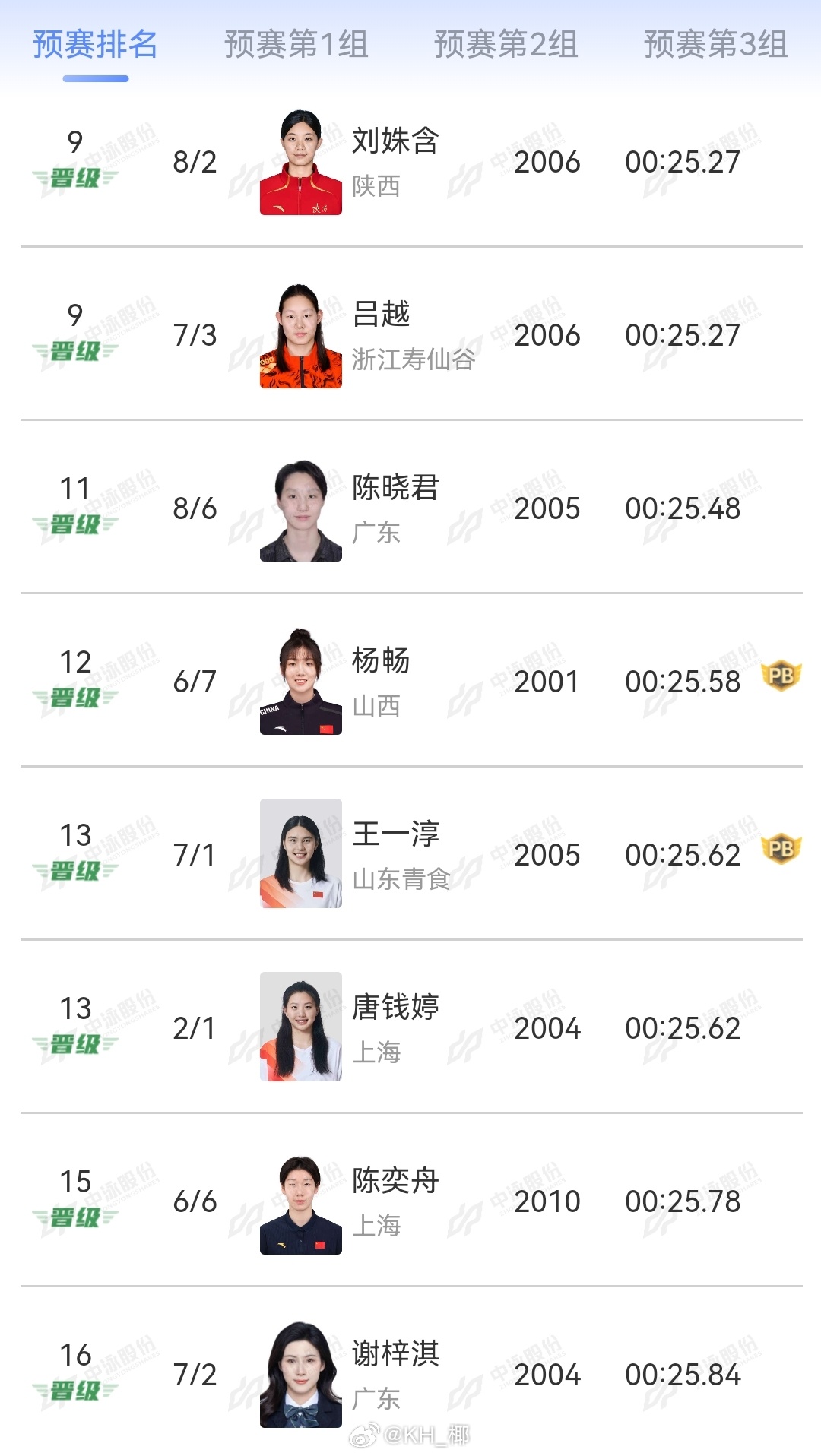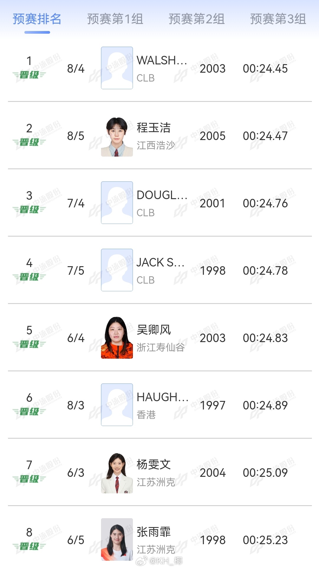 2026年中国游泳公开赛 女50自预赛🇺🇸小沃 24.45程玉洁 24.47🇺🇸道妹 24.76🇦🇺Jack 24.78🇭🇰何诗蓓 24.89吴卿风 24.83杨雯文 25.09张雨霏 25.23刘姝含 25.27吕越 25.27陈晓君 25.48杨畅 25.58唐钱婷 25.62 王一淳 25.62陈奕舟 25.78 谢梓淇 25.84