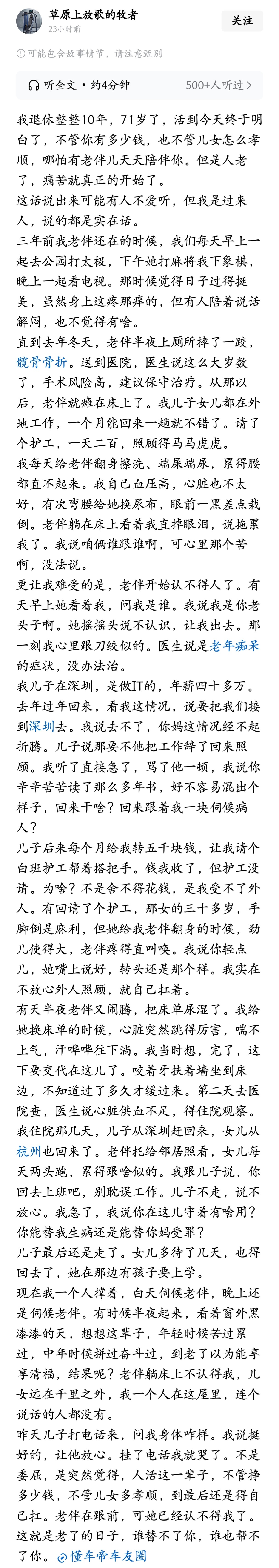 不管你有多少钱,也不管儿女怎么孝顺,哪怕有老伴儿天天陪伴你。但是人老了,痛苦就真