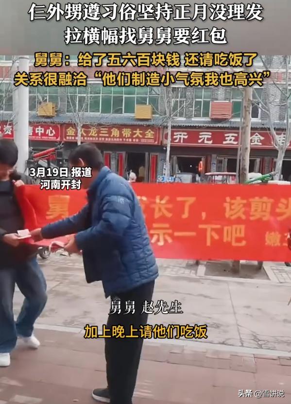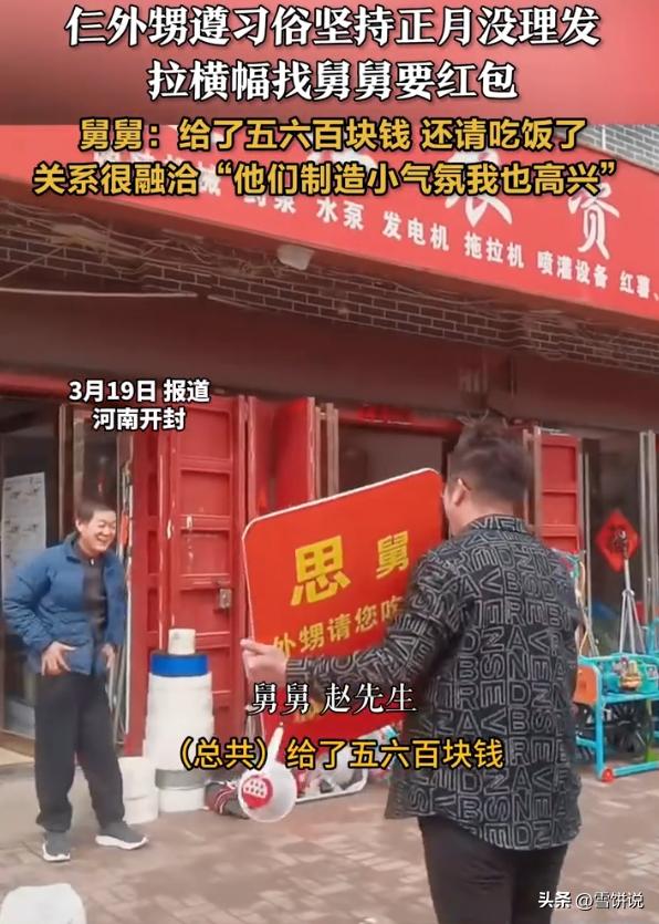 笑不活了!河南开封,三名年轻小伙在正月没有剪头发,正月一过,直接拉着横幅来找舅舅索要红包,舅舅看到后乐的合不拢嘴,不仅发了几百块红包,还请三个大外甥吃了饭 视频中,三个外甥早早就做足了准备,就等着正月一过来找舅舅,在横幅上面,他们写着“舅,头发长了,该剪头发了,你看这表示一下吧”。随后三人一路咧着嘴来到舅舅店里 舅舅看到后开心的不行,赵先生表示,按照习俗,正月当外甥的不能剪头,三个外甥就坚持了一个月没剪头,最后他给了五六百块钱的红包,晚上还请孩子吃了饭,孩子制造了一个小气氛,他也跟着高兴 对此,有网友说:这个舅舅太迷信了 说实话,正月不能剪头这种说法确实没啥科学道理。但话说回来,一家人过日子,有时候要的不就是这点仪式感吗? 外甥们是想找个由头和舅舅亲近亲近。舅舅心里跟明镜似的,知道孩子们是来逗乐讨彩头的,给钱请客也大方,图的是一家人开心 有些传统习俗之所以能传下来,不一定是因为它本身有多正确,而是因为它成了人情来往的由头。现在大家都忙,亲戚之间走动少了,有了这么一个梗,大家就有理由聚在一起,说说笑笑 舅舅乐意的不是外甥没剪头,而是外甥心里惦记着这个舅舅,愿意花心思来哄他高兴。这种互动比任何礼物都实在。至于那个说法本身对不对,根本不重要,重要的是大家高兴,日子有滋味