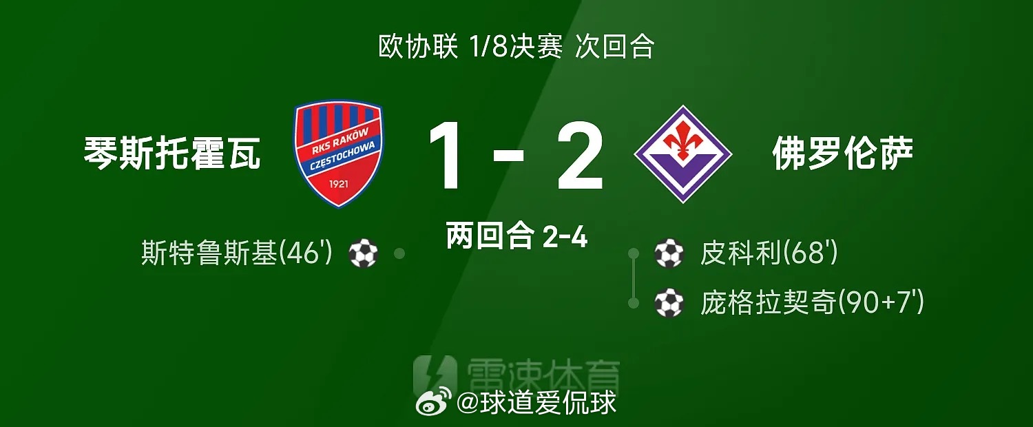 03月20日讯 25/26赛季欧协联1/8决赛次回合,佛罗伦萨2-1战胜琴斯托霍瓦,以总比分4-2(首回合2-1)淘汰对手晋级,庞格拉契奇第90+7分钟上演绝杀。全场比赛,皮科利、庞格拉契奇破门建功,斯特鲁斯基破门难救主。足球体育明星体育赛事足球