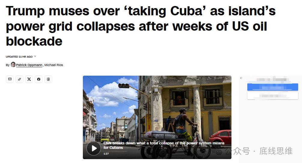 随着美以伊战争出现烂尾和危机溢出风险、共和党内对“二次踏入中东泥潭”的分歧和焦虑日益上升,急于塑造新“赢学”热点的特朗普在妇女节把13个拉美右翼极右翼领导人弄到迈阿密,召开了一场“和平(演变)、反共(古巴)、建国(MAGA)”的“共荣”峰会,提前庆祝了古巴的“最后时刻”: 唐纳德·特朗普的“圣意”飘忽不定,但他所依赖的这个充满右翼魔怔的“外交”团伙,对搞垮社会主义古巴的执念却是一以贯之的。虽然古巴国家主席迪亚斯-卡内尔和劳尔·卡斯特罗的代表一直努力与特朗普团队对话,但有鲁比奥这个“二鬼子”当道,预计这些对话和之前马杜罗的对话一样,指望“让”出什么各退一步、和平共处的结果,是基本不可能的事情——在伊朗战事越来越难“赢”下去的今天更是如此了! 3月13日周五,迪亚斯-卡内尔在全国广播讲话中承认,由于美国的石油封锁,三个月来已经没有燃料进入古巴境内。14日周六凌晨,古巴中部传统糖业地带——谢戈德阿维拉省的一些人在集会抗议粮食匮乏和停电后,打砸焚烧了古共莫龙市委大楼,这是1960年代剿匪结束以来从未出现的情况。16日周一,古巴再次发生全国范围断电。 不同于有战略纵深和军工体系的伊朗,甚至不同于至少能源可以自给的委内瑞拉;经历了疫情以来的长期困境、长达六十余年令人疲惫的封锁和十余年未按预期生效的“改革”和“开放”,在无数次孤身成功对抗美国帝国主义暴政的神话之后,古巴可能已经真的来到了某种临界点边缘。 笔者现在非常担心,如果没有强有力的、足以对冲特朗普这波极限施压的国际援助,甚至不需要等到特朗普政权设定的“实现古巴政权更迭”的“2026年底”时限,古巴形势就将发生某种不可逆的变化。 目前,包括美国在内许多欧美和非洲国家的共产党、左翼团体和民间进步人士(例如我们大多听说过的科尔宾、哈桑甚至“环保少女”通贝里等)正在组织一个名为“我们的美洲运输队”(Nuestra América Convoy)的对古支援项目,试图靠海空联运突破美国政府的封锁,在3月21日将一批人道主义支援物资送进哈瓦那。然而,他们毕竟只是一些有正义感的普通人。在这个空前的特殊时期,古巴仍然需要更加强大有力的援手。【文|花舞影 时政观察者】