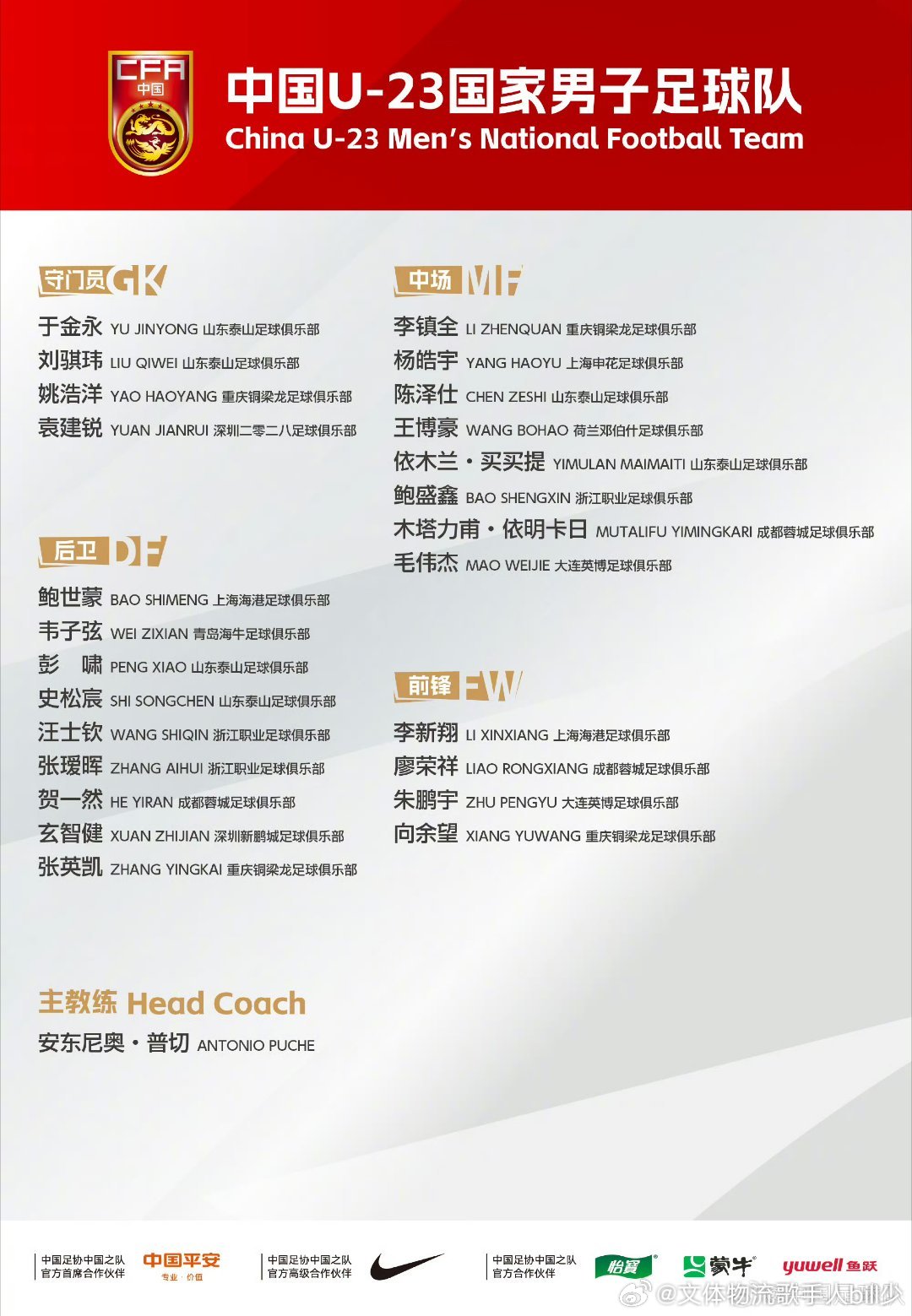 最新一期u23,成年国足集训名单公布