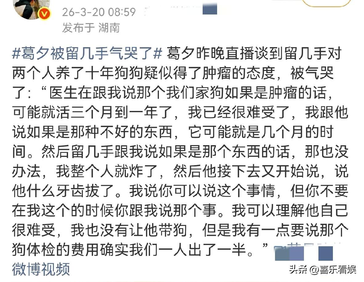 葛夕,曝被留几手气哭 3月20日,葛夕留几手冲上热搜,原因是葛夕在直播时,曝曾被留几手气的暴哭,引起了热议。 葛夕表示,自己养了十年的狗狗疑似得了肿瘤,医生说最多活一年,少则三个月。 她本来就难受到不行,转头跟留几手说这事,结果对方轻飘飘一句“那也没办法”。 更戳人的是,她正陷在狗狗可能要走的情绪里,留几手还接着说自己拔牙的事,完全没接住她的崩溃。 葛夕谈起这事的时候,整个人也还是很难过,声音哽咽,眼眶也有泪水,她表示:“我可以理解他难受,但你别在我这个时候说啊!” 看到葛夕说的这个事,有人说:“她也挺较真的,男人和女人思维差太大,留几手就是理性说法,她要的是情绪价值。” 也有网友说:“留几手对人都没啥感情,还指望他对狗多温暖?”“这就是三观不合,还好离婚了。” 也有嘴毒的网友直接吐槽:“都离婚几年了,不说留几手她会si啊!”,虽然话糙,但也点出俩人早就没了情分,连这点共情都给不了。 其实说白了,葛夕气的不是那句“没办法”,是自己掏心掏肺的难过,在对方那连一点情绪缓冲都得不到。 养了十年的狗跟家人一样,换谁在这种时候被泼冷水,都会炸吧? 对此。你们怎么看?