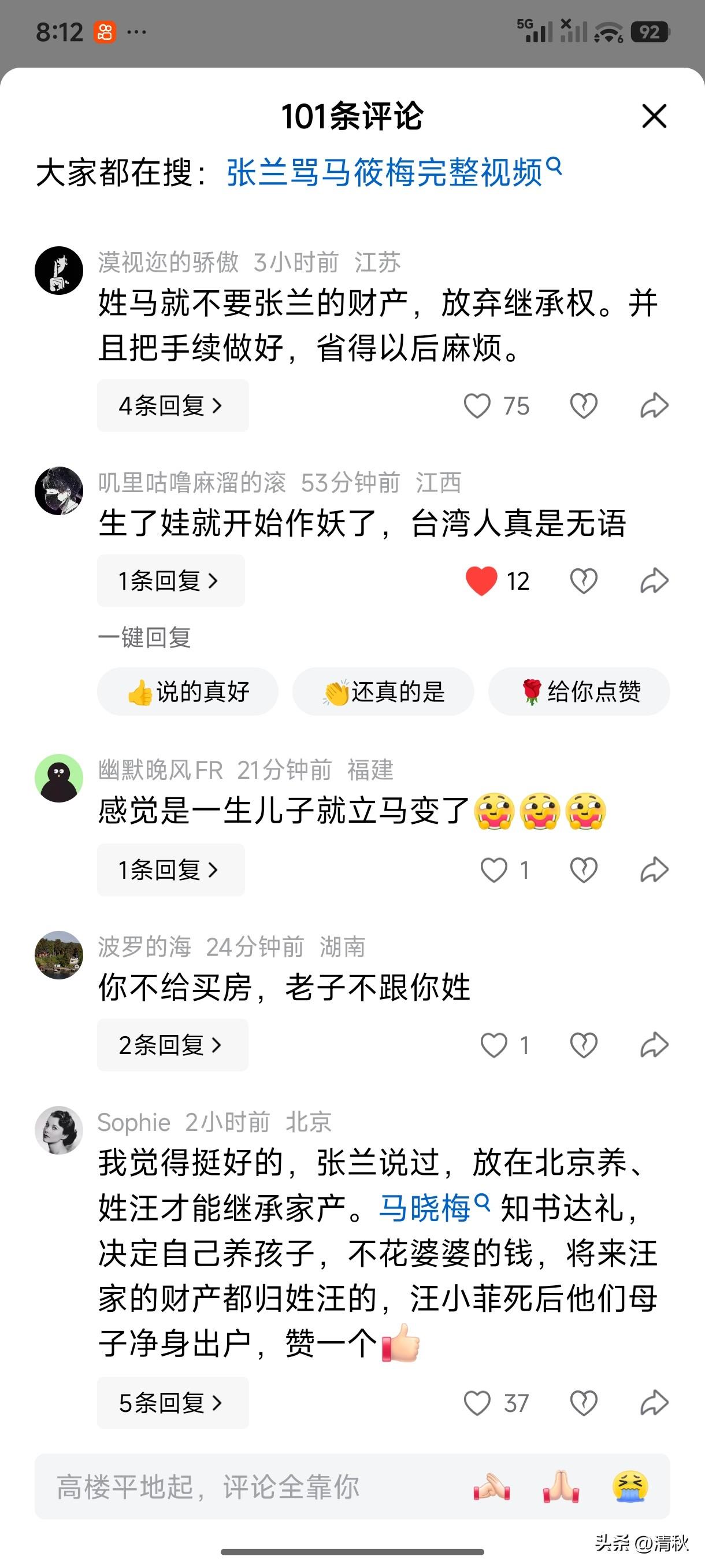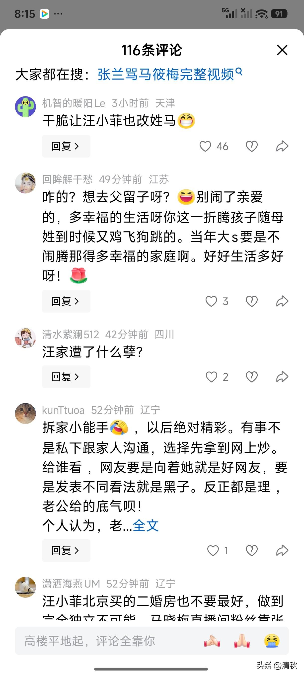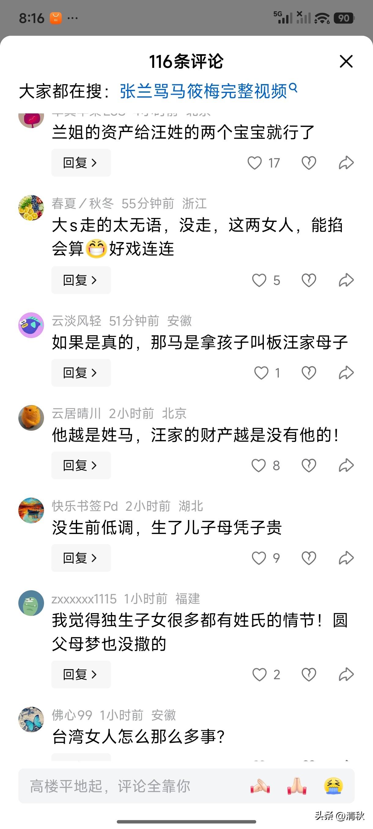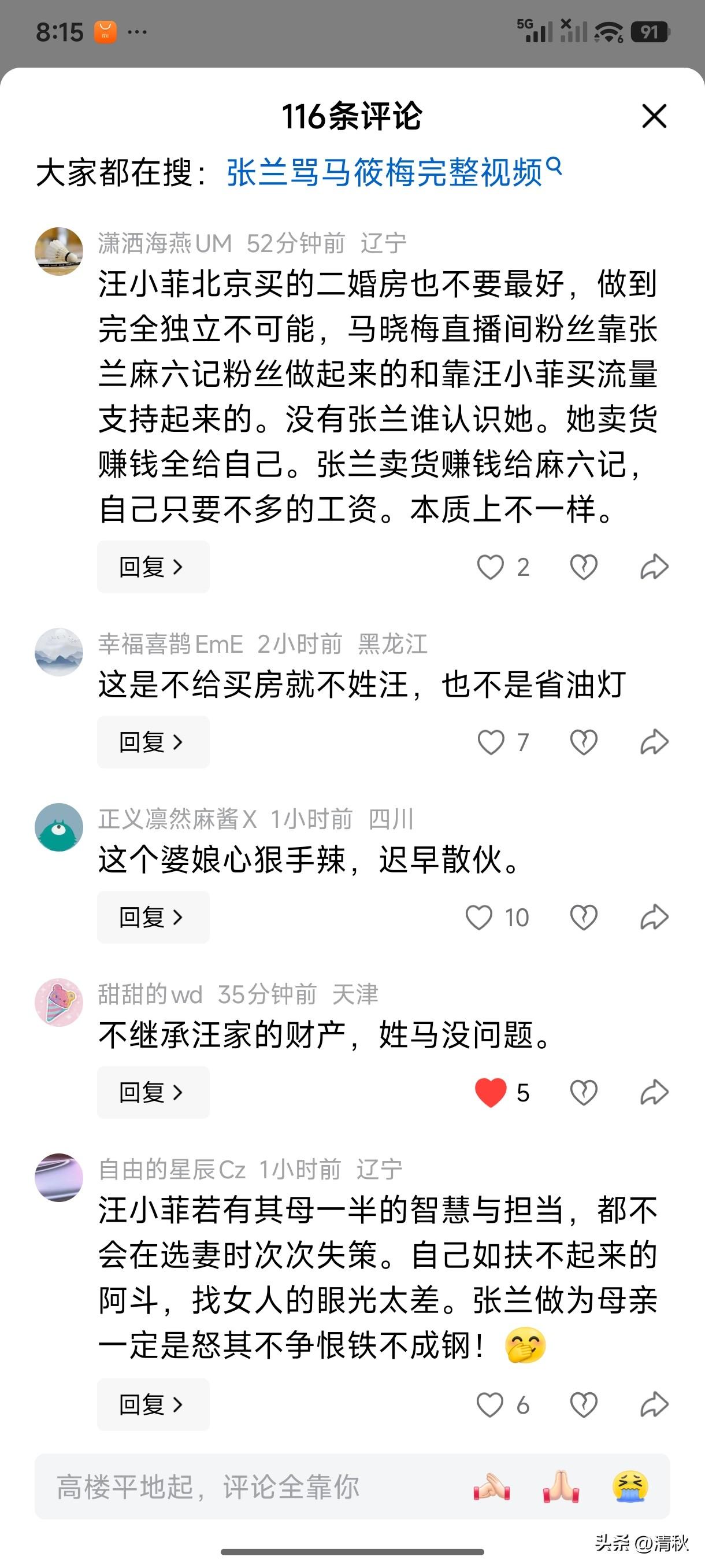 我早说过二婚马就没有那么单纯,网上爆料和前夫离婚就收获了一笔财富(当然不知道是真是假),但是网上她和前夫的亲密照足以说明他俩曾经爱得很深,可是离婚后跟了汪,又是那么多亲密照,我不信一个恋爱脑的女人会这么快忘了前任,和第二任很快就一见钟情?所以说她一定是个很现实的女人,她只是通过婚姻来改变自己的生活阶层。 网民们太小看张兰了,她阅人无数,久经商场,她会认为这个儿媳妇比前儿媳好吗?我想她早就知道这个马不是善茬,可能因为拗不过儿子,其实她们都是在镜头前演戏,目的就是演家和万事兴,带货赚米是真的。 大S再不好,她还让两个孩子姓了汪,她曾经身价上亿,跟汪结婚,我觉得她才是爱得纯粹。以前张兰及一些网民都在谴责大s不让孩子回北京,可是现在孩子的抚养权都在汪手里,为啥俩孩子还是没能来北京?现在想想这跟大S有啥关系呢? 马刚跟汪在一起时穿的不上档次,而且装得像淑女,一开始汪对她不咋滴,她倒是很乖,动不动投喂汪,凡事都依着他,慢慢地把他的心抓住了,就开始心眼一点点暴露出来了,现在有了儿子,就像网民说的那样,儿子一出生就迫不及待跟婆婆杠上了,打着汪看上台北上亿豪宅的幌子,实则是在试探婆婆,一看婆婆不出钱,就开始想办法出幺蛾子,说什么想让孩子跟自己姓,网民们说的也对,你爱姓啥,反正汪家有孙子孙女,不缺你一个,感觉生个儿子成了要挟人的工具了,再不济就是看上人家的基因生个儿子,天天直播间演戏,假话吹牛说多了,时间长了就自己戳穿了,曾经说自己家财产都继承不过来,说自己是年入2亿的茶场老板千金,殊不知被网友挖出来是卖早餐的,这会自己又在直播间说家里就两套房,一套小一居出租,一套还在还房贷,父母还住着爷爷的房子,说外祖父的遗产够几代人花了,又是亲戚全是清北高学历……,可能自己说过多少谎话都记不清了,在直播间编着编着就把自己的谎言拆穿了。 原来支持她的粉丝,现在也对这迫不及待的吃相反感了,这样下去凉凉了。
