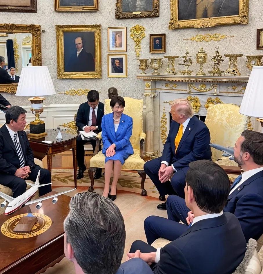 日本首相高市早苗终于在白宫椭圆办公室见到他心目中的大哥特朗普! 从现场可以看到,高市早苗身着蓝色套装端坐在黄色锦缎椅上,双手交叠膝前,嘴角带着标志性的微笑。作为首次到访白宫的日本首位女性首相,她的姿态显得很卑微。反观特朗普,黄色领带在深色西装间显得格外醒目,特别是他的强势坐姿,也在传递“美国优先”的外交姿态。在中东冲突的敏感节点,特朗普正试图向日本索取更多军事与能源支持。高市旁边的日本外长茂木敏充神情肃穆,双手交叠,小心翼翼地见证着这场美日高层博弈。椭圆办公室背景墙上,历任总统包括富兰克林、威尔逊等肖像与镀金浮雕装饰格外醒目。壁炉上方整齐排列着七件鎏金器皿,搭配华丽的金色浮雕装饰,彰显特朗普对“奢华与力量”的审美偏好。茶几上的空军一号模型,既是总统权力的符号,也暗含力量投射的隐喻。 客观地说,高市早苗与特朗普的这次会见,是美国试图维系霸权主导,而日本在依附与自主间游走的直观体现。