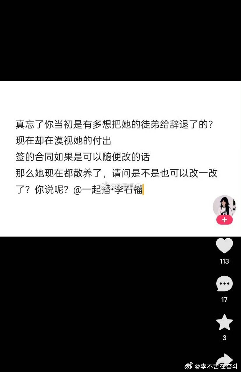 此处艾特一起播传媒·李石榴,既然想改她徒弟的抽成,那也请把她的抽成比例改一下,毕竟她现在散养。作为领头人做到一视同仁不难吧?或者把她10年的合同也改一下呢hhh