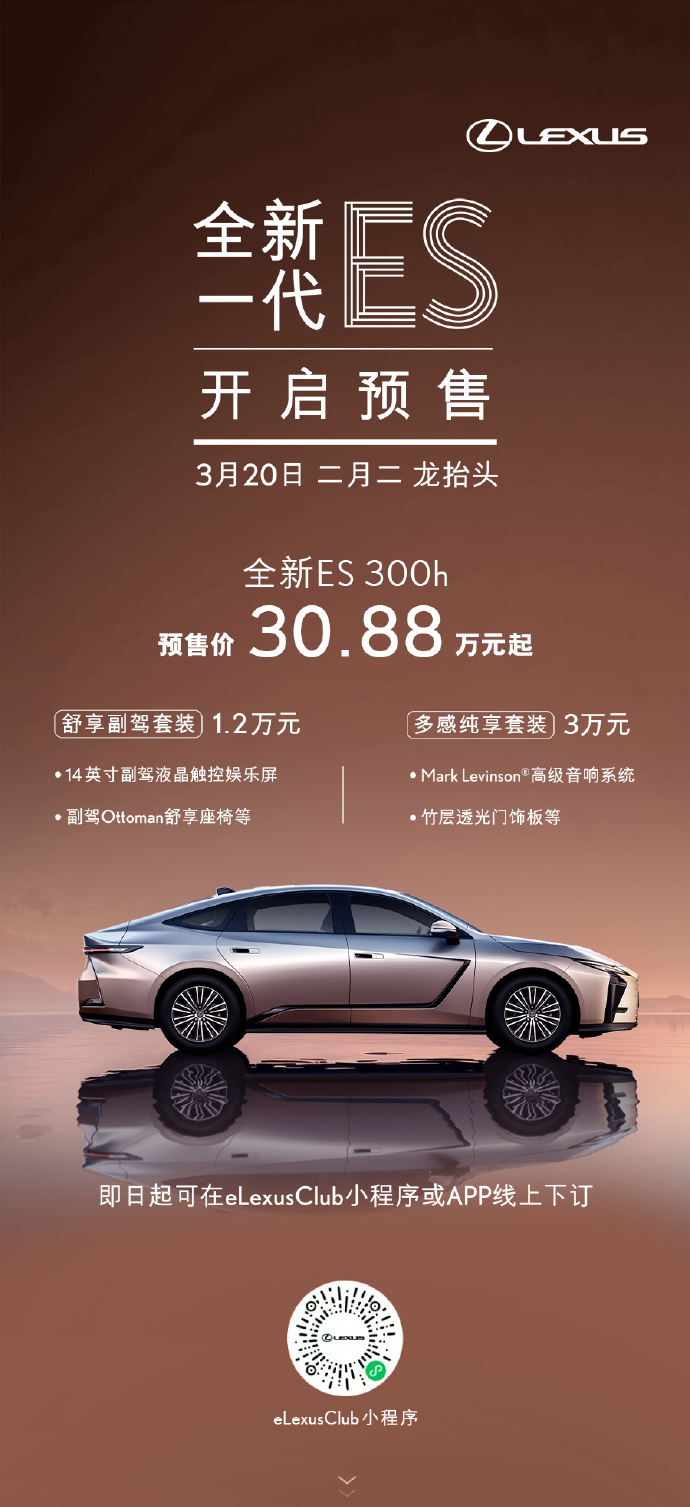 【2026款雷克萨斯ES开启预售:提供混动 / 纯电双动力可选,预售价 30.88 万元起】全新一代雷克萨斯 ES 正式开启预售,预售价 30.88 万元起。新车基于 GA-K 平台打造,提供混动版 ES 300h 和纯电版 ES 350e/500e,不再推出纯燃油车型。车身尺寸全面加大,内饰采用双联屏设计,并搭载新一代智能安全系统。新车将于 4 月正式上市。