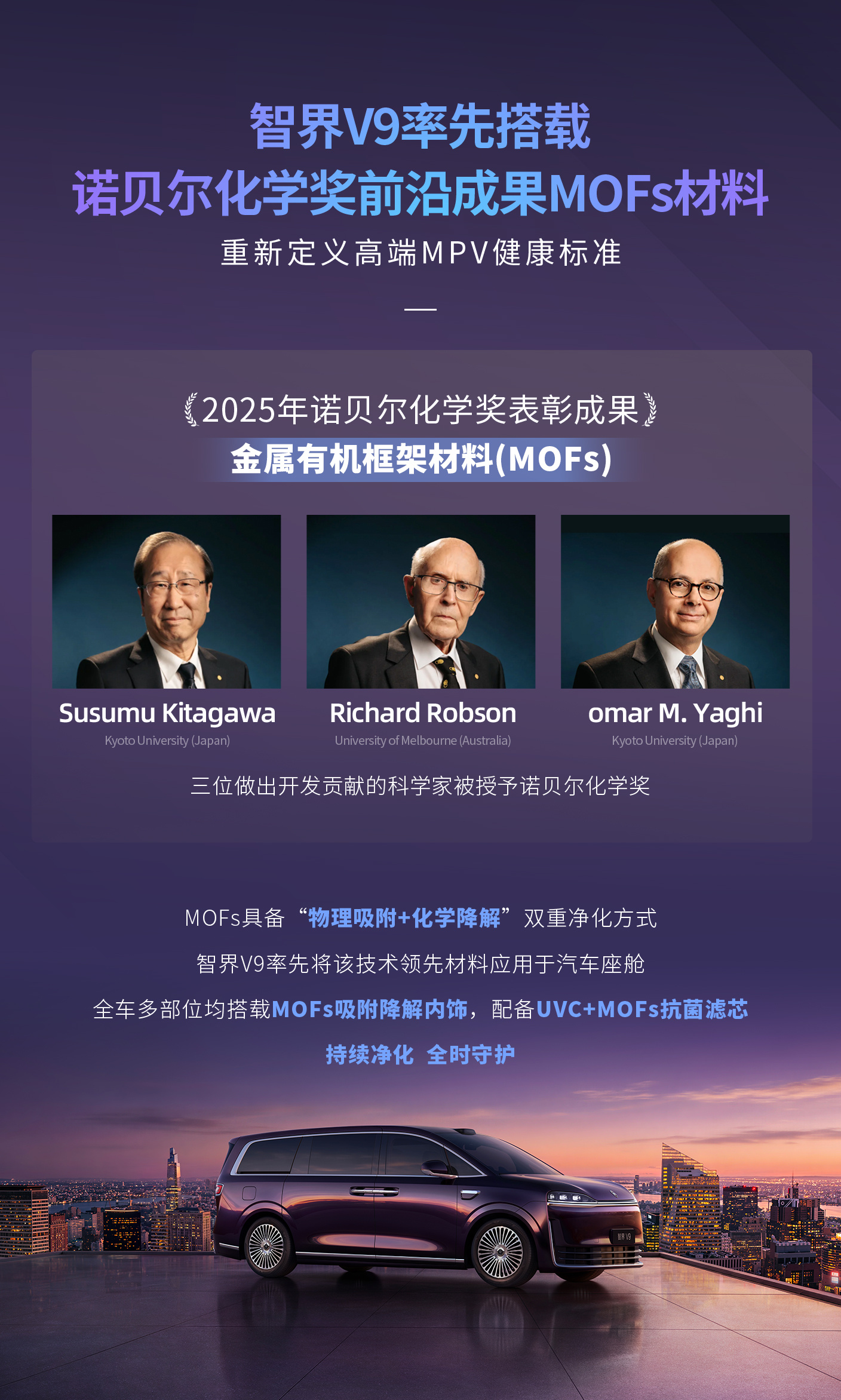 智界V9直接把诺奖前沿成果MOFs材料搬上了车,车顶棚、门板这些补位加了MOFs材料,还配备了UVC+MOFs抗菌滤芯,可实现物理吸附+化学降解双buff,不光吸走PM2.5、五苯三醛这些有害物,还能把醛类拆成水和二氧化碳,不用开净化也能24小时默默工作。
