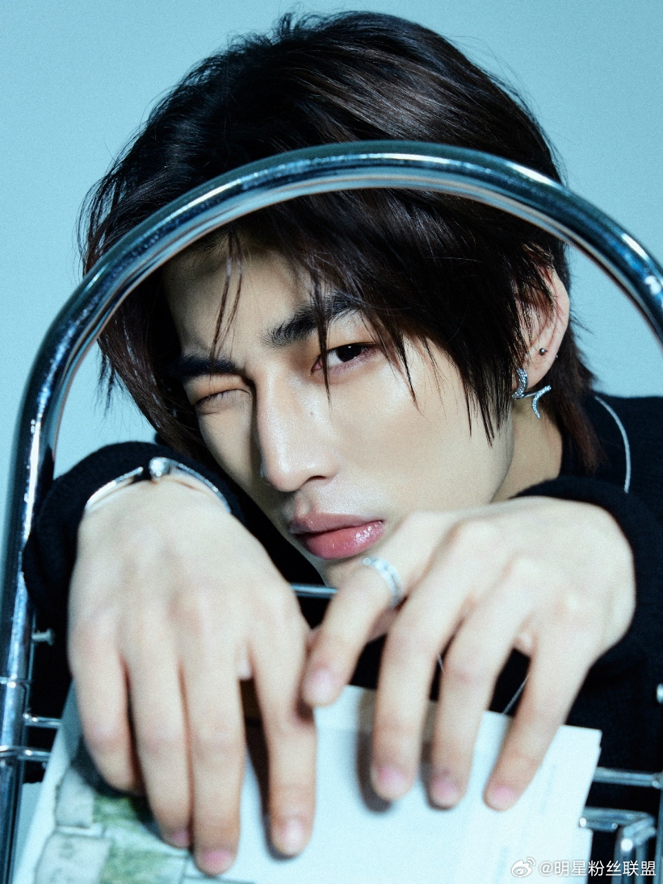 林秋楠 轻点帅你小子偷偷藏了多少帅照啊!蓝调背景+黑毛衣,氛围感直接拉满,连耳朵上的小耳钉都在散发魅力,帅到想原地转圈圈!