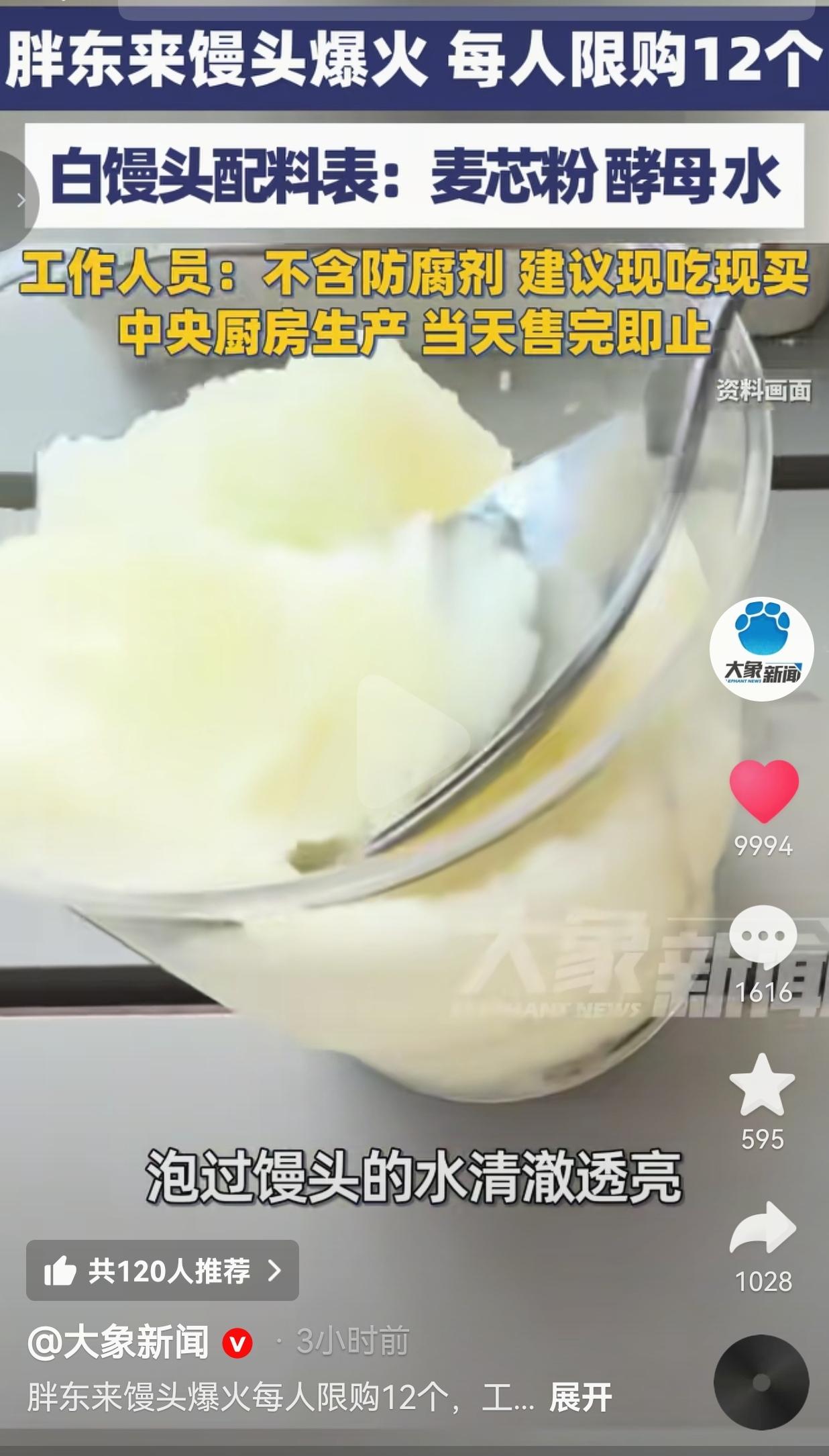 疯了!胖东来馒头限购12个!配料表干净到让同行脸疼到发紫! 一个白馒头,能把许昌人逼成这样?每人只能买12个还抢破头!这哪是卖馒头,这是在给添加剂行业甩巴掌! 3月19号,胖东来的馒头直接炸穿全网。你敢信吗?它的配料表就三行字:麦芯粉、酵母、水。连个防腐剂都没有!工作人员说,这馒头全是无菌车间做的,凌晨就送到店里,当天必须卖完,剩一点都直接扔掉,绝不隔夜。 网上有人做了个实验:把胖东来的馒头泡进水里,水干干净净一点杂质都没有。再去看看超市里那些放家里半个月都不发霉不变硬的馒头,你就懂了,这里面到底是“良心”还是“套路”。 别人家为了好看、耐放、利润高,往馒头里塞十几种添加剂,把消费者当傻子糊弄。胖东来倒好,用最朴素的材料,卖最便宜的价格,还限购怕你囤货不新鲜。这是做生意吗?这是把老百姓的健康真当回事啊! 网友评论区都快吵爆了,有的网友说出妈妈的经历: “我妈早上六点就去排队,就为了这口馒头!她说吃着跟外婆当年蒸的一个味,香得我都想跟着哭!” 也有的网友说: “这馒头泡水都那么清!胖东来是真敢把同行的遮羞布一把扯掉!” 也有的网友说: “12个都不够我家吃的!我家孩子只吃这个,别的馒头他闻一下都嫌恶心!” 还有的网友说:“现在吃个放心饭怎么这么难?胖东来就配让我心甘情愿排队!” 我每次走进胖东来,心里都发酸。 别人都在压成本、延保质期、拼命赚钱,只有胖东来在琢磨怎么让你吃得安心。 一个馒头用得着这么较真吗?胖东来说:用得着!因为这是给人吃的,不是给机器做的! 大家怕的从来不是贵,是怕花了钱买回来一堆不知道是什么的东西。胖东来用一个小小的馒头证明:做生意可以不玩套路,但良心一定有市场。 这不是一个馒头的胜利,这是普通人对干净、踏实、真实生活的渴望,是对那些偷工减料的商家最响亮的打脸。 最后我想说的是:胖东来赢的不是生意,是敢把老百姓的命,当回事。 对此,你怎么看?