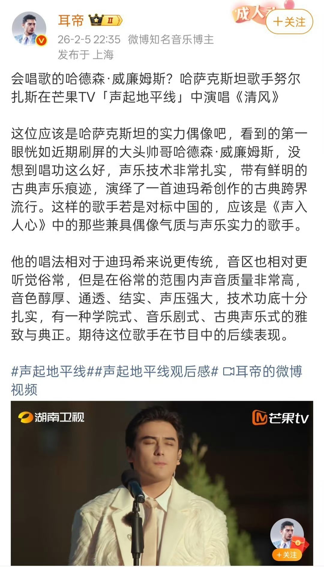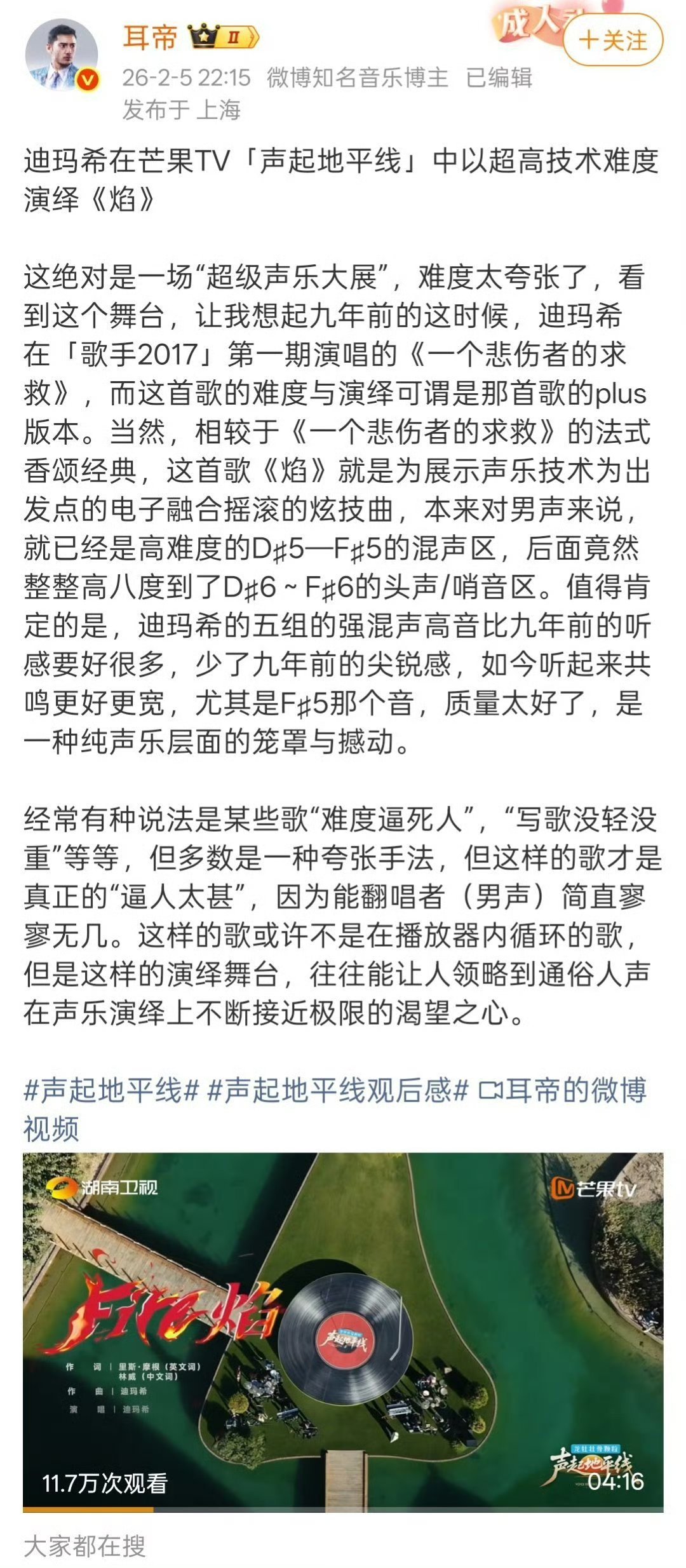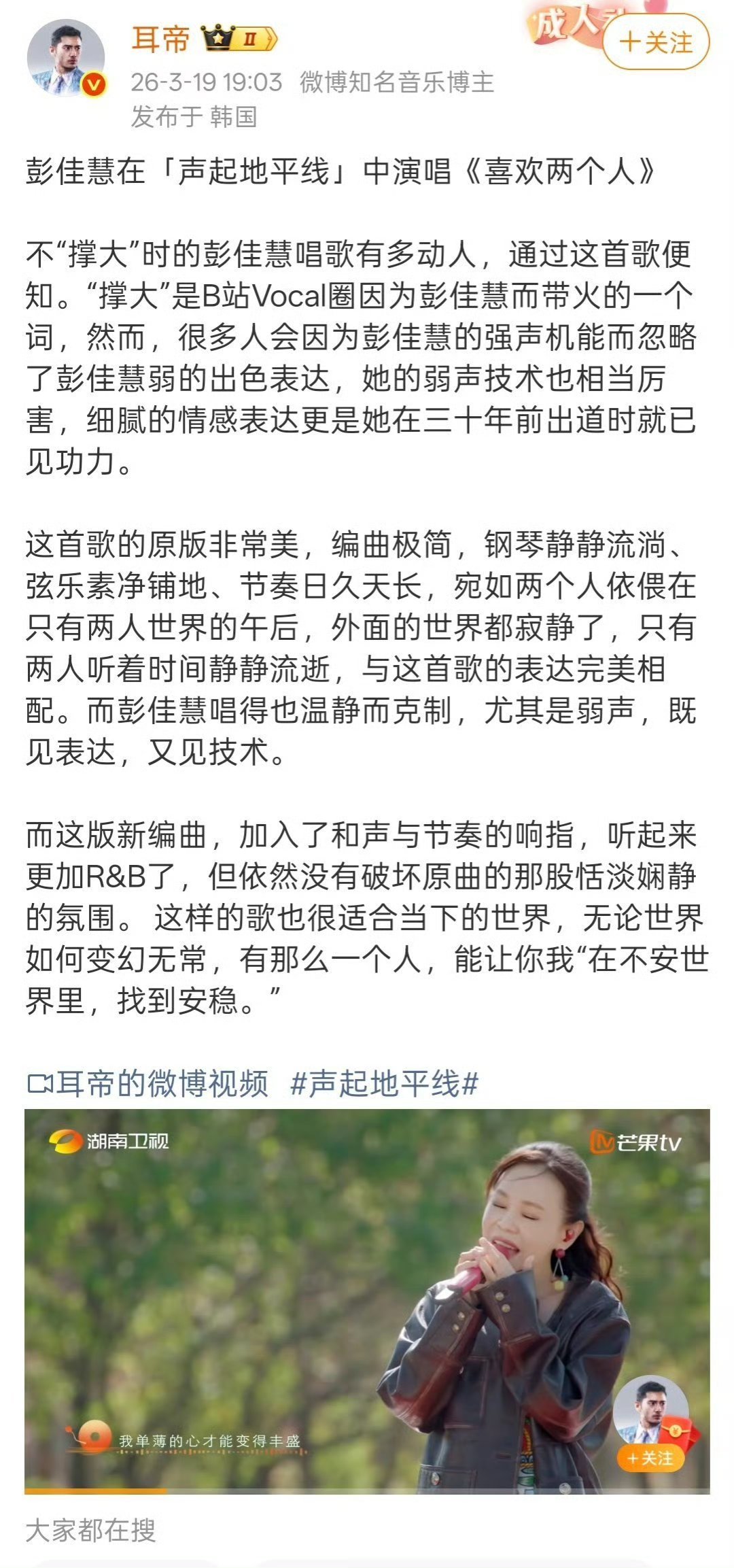 被耳帝三次发文推荐的音综不愧是专业认证的好音综!直接被耳帝接连三次发文推荐,还深度锐评彭佳慧舞台,从编曲到演唱细节全方面剖析~耳帝发小作文锐评彭佳慧