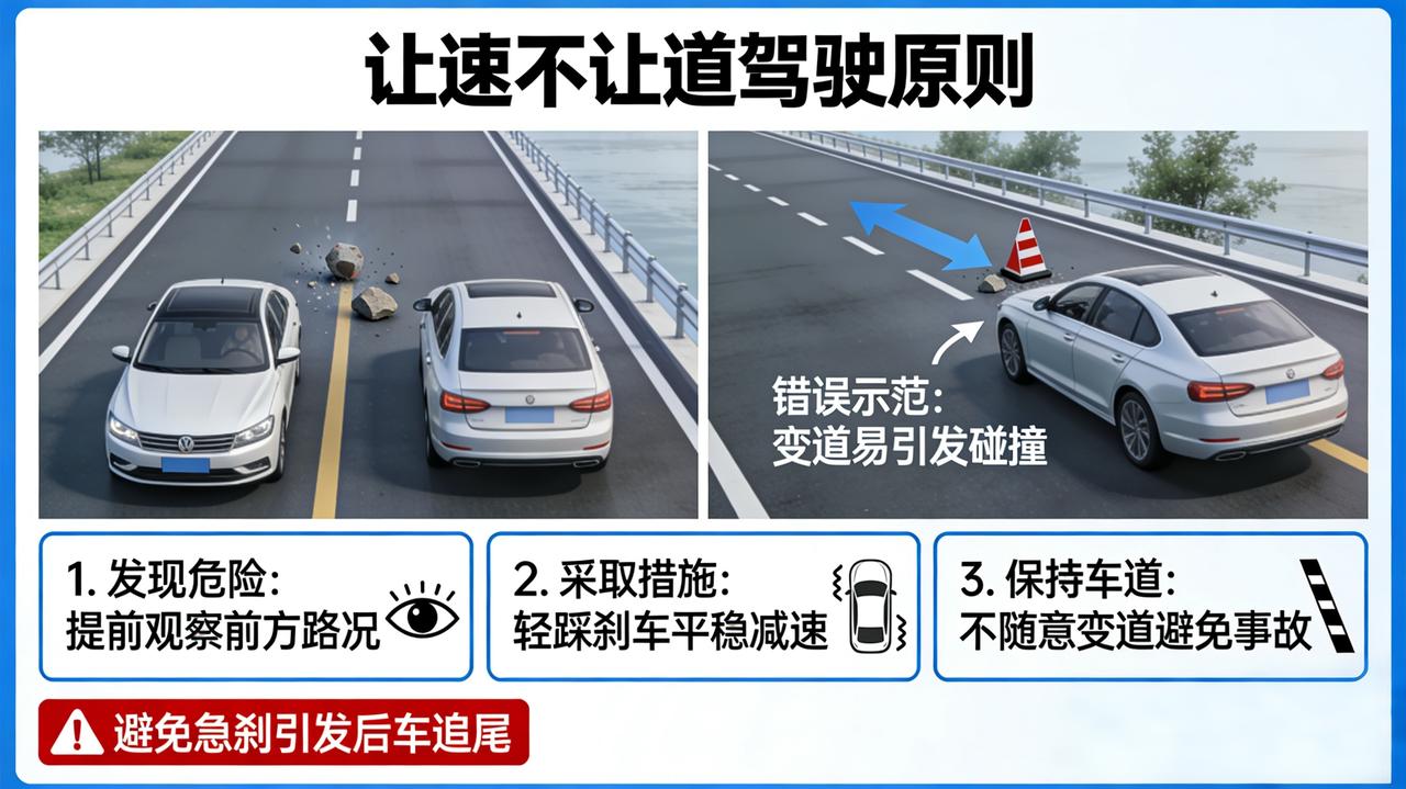 《为什么老司机都建议“让速不让道”?看完你就懂了》 开车时遇到有人加塞,很多人的第一反应是打方向避让,但老司机都会说:让速不让道。 这句话的意思是,遇到突发情况时,可以踩刹车减速,但不要随意变道避让。因为你变道的同时,很可能和旁边车道的车辆发生碰撞,反而造成更严重的事故。 比如有人从右侧加塞,你如果急打方向往左躲,就可能和左边车道的车追尾。所以正确的做法是:踩刹车减速,保持自己的车道,让对方自己去处理。记住,守住自己的车道,就是守住自己的安全。 让速不让道 开车安全技巧