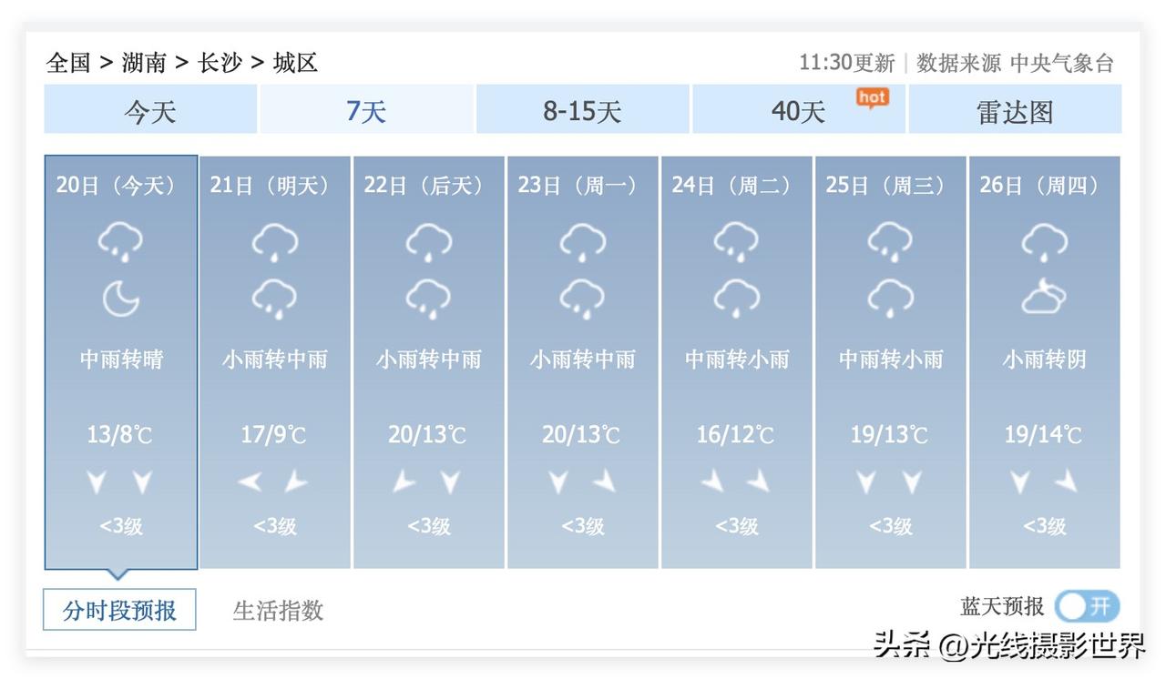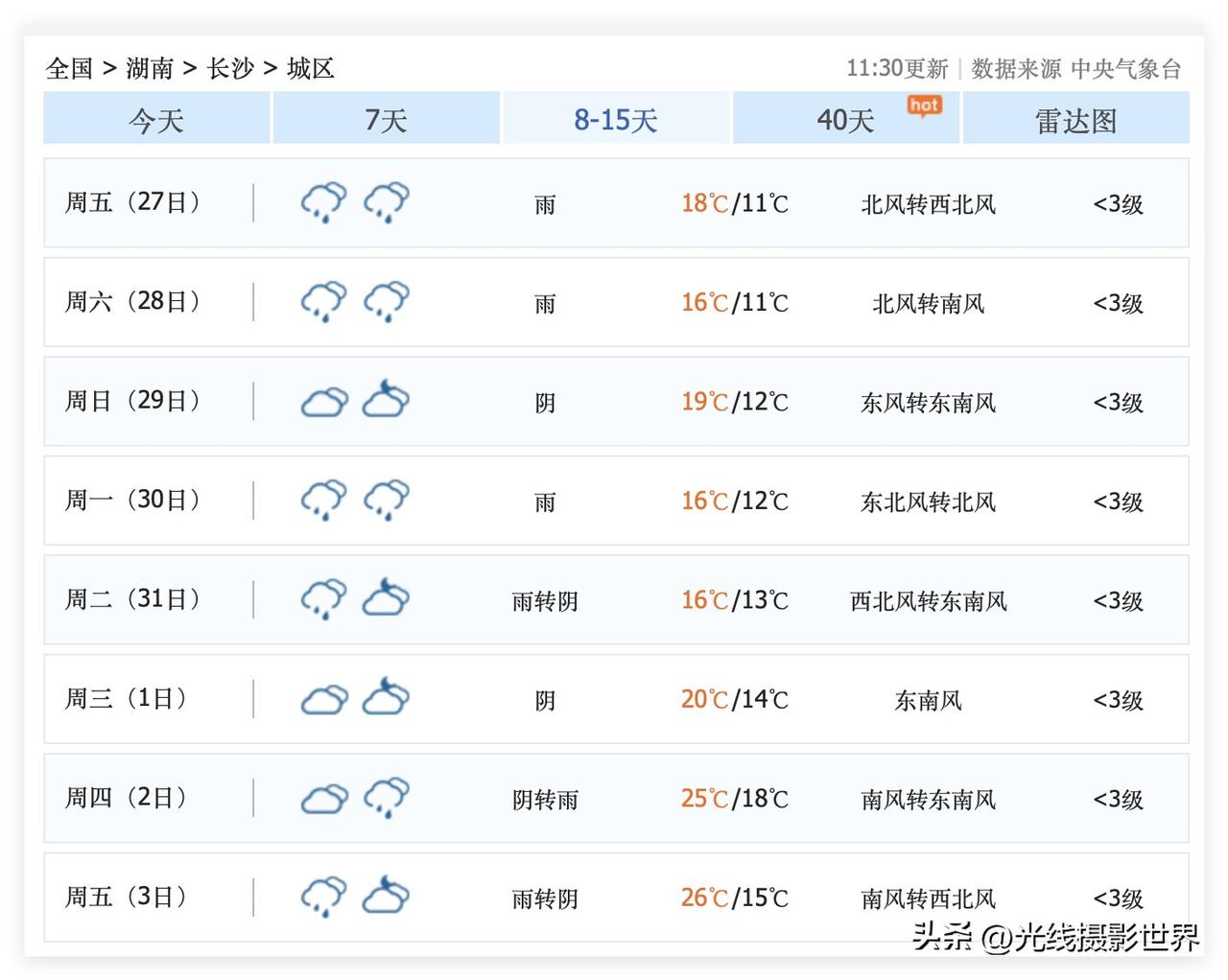 日也盼夜夜盼,长沙什么时候出太阳啊?!3月20日,中央气象台的最新湖南长沙天气预报显示……未来10天半个月,长沙市阴雨连绵……这春雨,就要赖在长沙不走了吗?! 难道,这春雨要一直下到迎接真正的夏天来到?! 3月21日,星期六,长沙小雨转中雨。 3月22日,星期天,长沙小雨转中雨。 3月23日,星期一,长沙小雨转中雨。 3月24日,星期二,长沙中雨转小雨。 3月25日,星期三,长沙中雨转小雨。 …… 3月28日,星期六,长沙下雨。 3月29日,星期天,长沙阴天。 嗯,超级计算机认为,下周,长沙还是不会出太阳。 而且,临近清明节,3月底4月初,目前的中长期天气预报显示,大趋势是这样,阴雨连绵为主…… 长沙的这波太阳流浪记,究竟什么时候迎来大结局呢?! 估计每个长沙人都翘首以盼吧! 还好,这周末,杭州天气不错,长沙人,沪昆高铁,几个小时就到杭州了吧?! 杭州白堤的桃红柳绿,曲院风荷的樱花,太子湾的樱花,苏堤春晓……