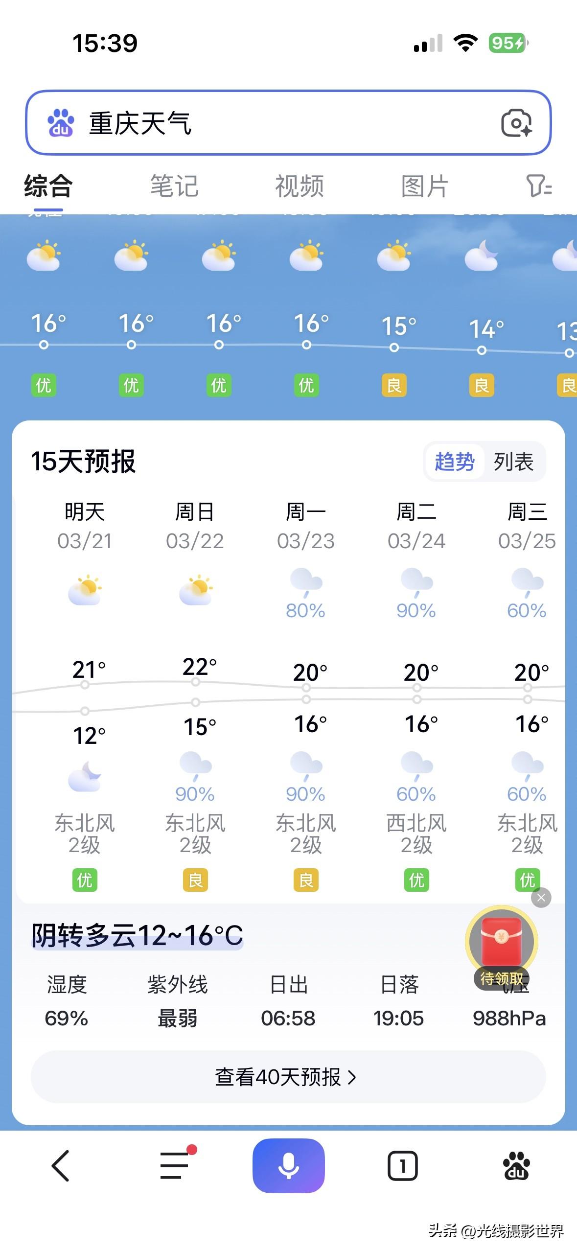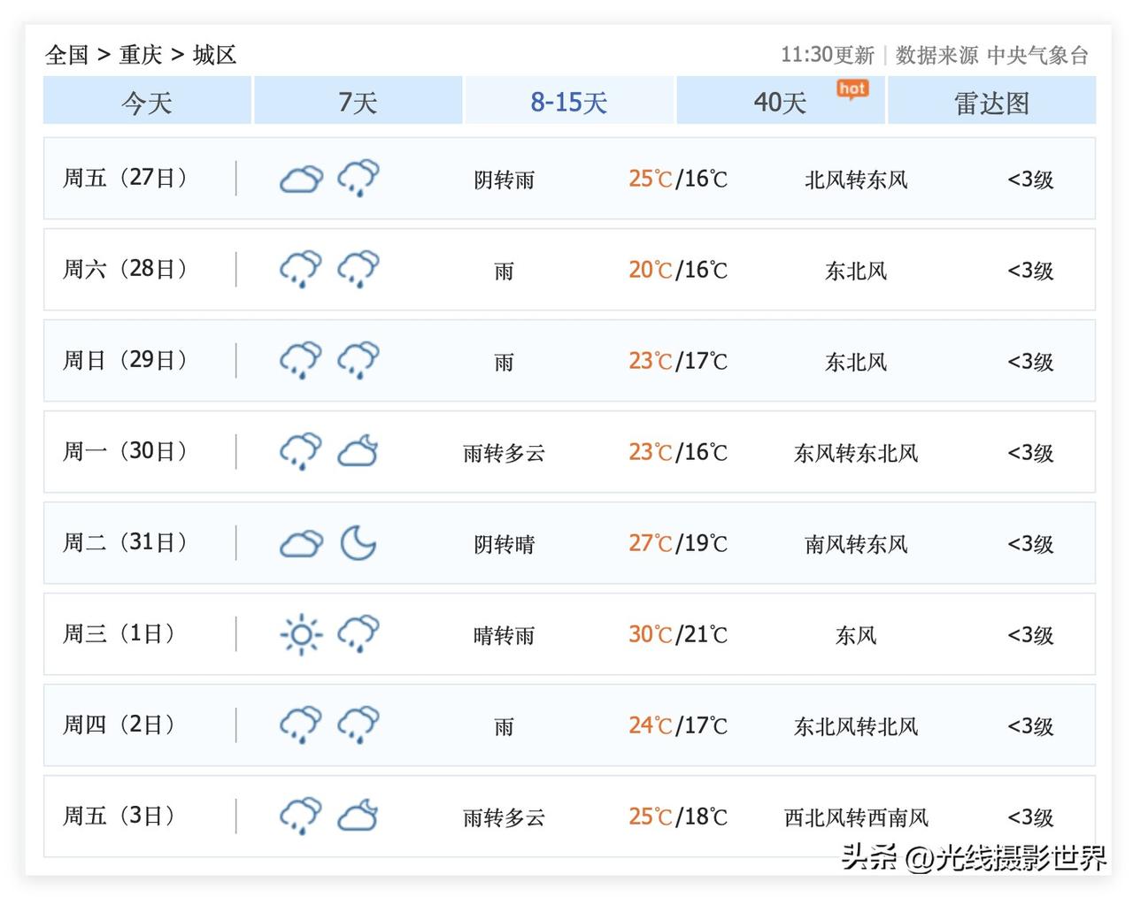 太棒啦!这周末,重庆终于要出太阳啦!3月21日,星期六,重庆主城区,多云晴好,最高气温快速回暖至21度!啊啊啊,最近的降雨降温真的好难过……我又穿上了秋衣秋裤……真想早点脱掉啊! 中央气象台的最新重庆天气预报显示,这周末,重庆天气晴好,最高气温22度,非常舒服的春天又回来啦! 虽然下周一又要开始降雨……但是,下周的降雨并不会导致降温哦!气温将会持续稳定回暖! 3月22日,星期天白天,重庆主城区,多云,最高气温22度。 …… 3月23日到25日,重庆主城区,每天都是小雨,但是,最高气温依旧20度…… 超级计算机甚至认为,4月1日,重庆主城区,可能会冲刺30度高温哦! 好吧,这周末,重庆人,抓紧时间赏花吧! 碧津公园的紫藤花,华岩寺的紫藤花,西南大学的紫藤花……江津农村璧山农村的紫藤花……是这周末最适合的花! 嗯嗯,蔷薇花也上线了!礼嘉公园的蔷薇花……川外小铁路的蔷薇花! 最后,别忘了绣球花,平顶山公园的绣球花,等着大家去打卡拍照哦! 哎,下周一开始,重庆主城区,又要开始持续阴雨天啦!