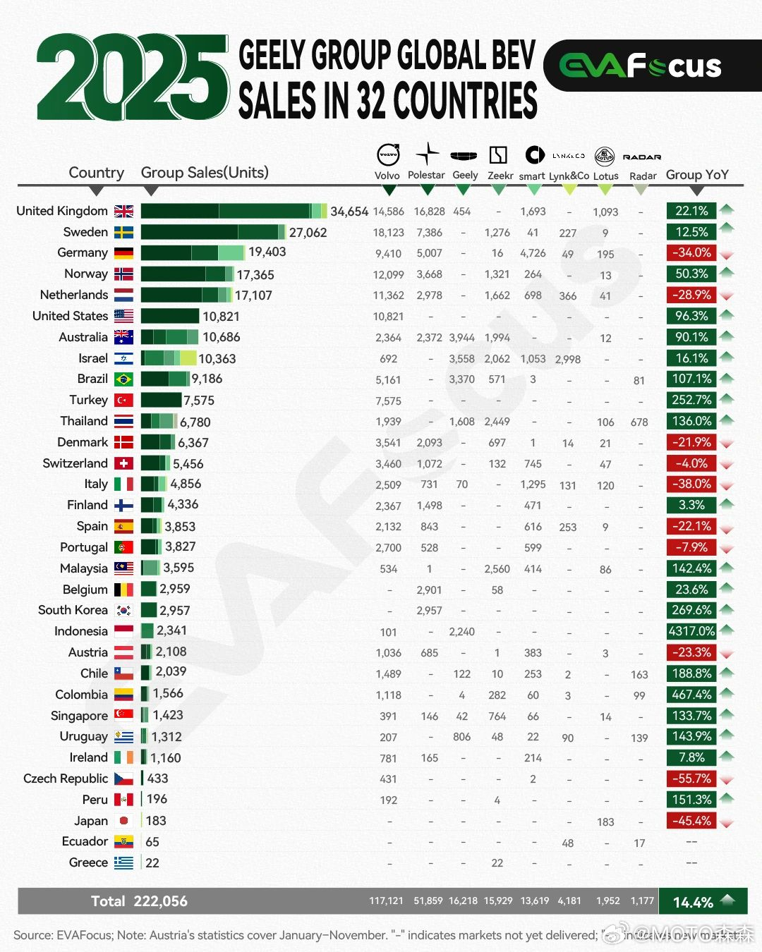 海外汽车博主做的图,吉利系品牌25年海外32国纯电车型销量