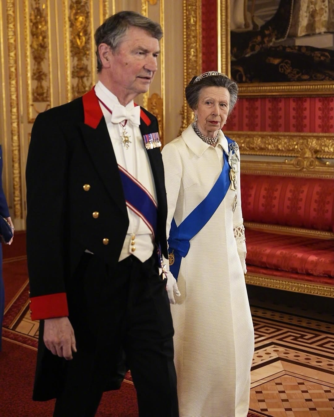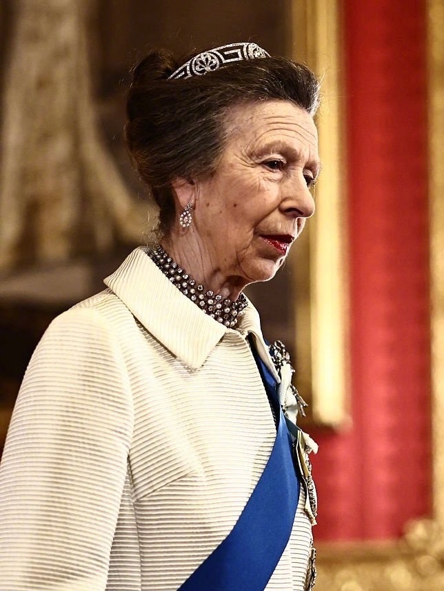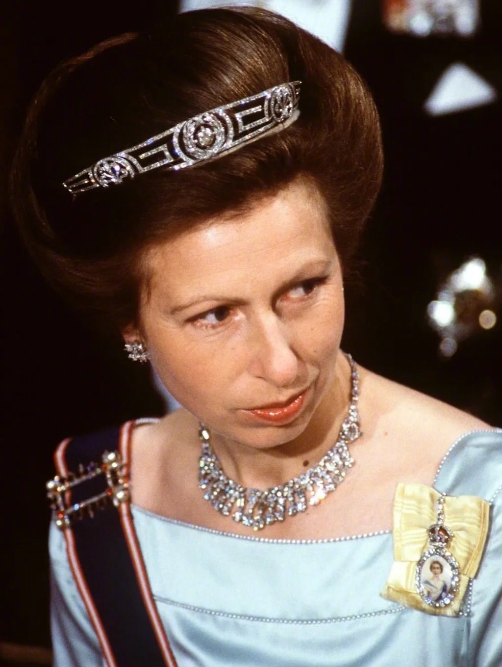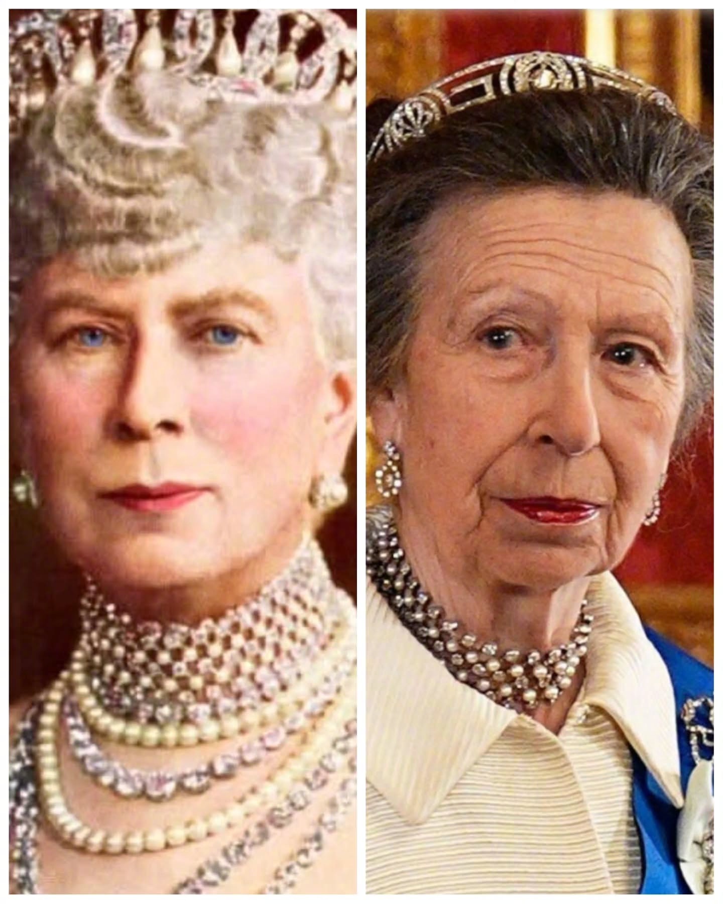 安妮公主佩戴的是原本属于菲利普亲王的母亲-希腊爱丽丝公主的“Meander Tiara”(回纹王冠)”,在安妮公主18岁生日时王冠赠予给了她。佩戴的钻石耳环和珍珠项链同样是她父母在她18岁生日时送给她的礼物(这两样原属于玛丽王后)。她的女儿扎拉在2011年的婚礼上也曾佩戴过这顶王冠和这对耳环。