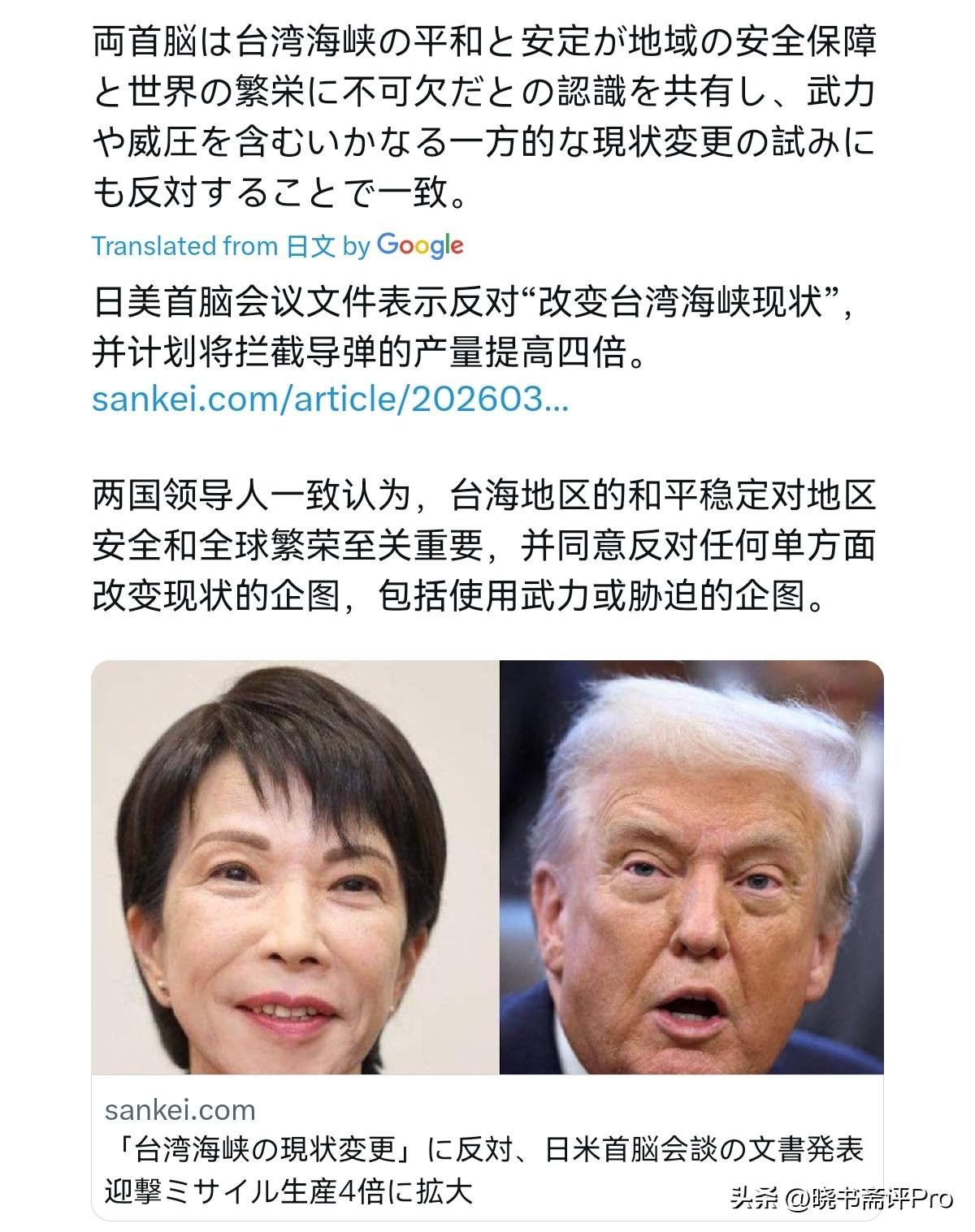 没见过这么无耻的声明的!美国正在以武力攻击伊朗,转过身美日发表联合声明声称,坚决反对任何单方面改变现状的企图,包括任何涉及武力或胁迫的企图。3月20日,根据日媒报道,在高市早苗与特朗普会晤之后,两国发文声称,两国领导人一致认为,台海地区的和平与稳定对地区安全和全球繁荣至关重要,并同意反对任何单方面改变现状的企图,包括任何涉及武力或胁迫的企图。 双方还同意将改进型SM-3 Block 2A拦截导弹的产量提高四倍,以加强威慑力。一方面是美国以武力攻击伊朗,一方面是在我们的内政问题上,美日声称不允许使用武力。说实话,真是没有见过这么无耻的声明的。那我们倒是想问的是,美日反对美国和以色列以武力方式攻击伊朗吗?这已经不是双标,而是脸都不要了。 台湾是中国不可分割的一部分,以何种方式解决台湾问题,由我们说了算。践踏国际法的美国没有任何资格对我们提要求,对美国装聋作哑的日本,自己本就是一个国际笑话。我们的立场很清楚,任何以军事介入台湾问题的国家等同于对我们的侵略,我们将进行坚决的反击。我们也会为两国的挑衅行为,做好应对准备。