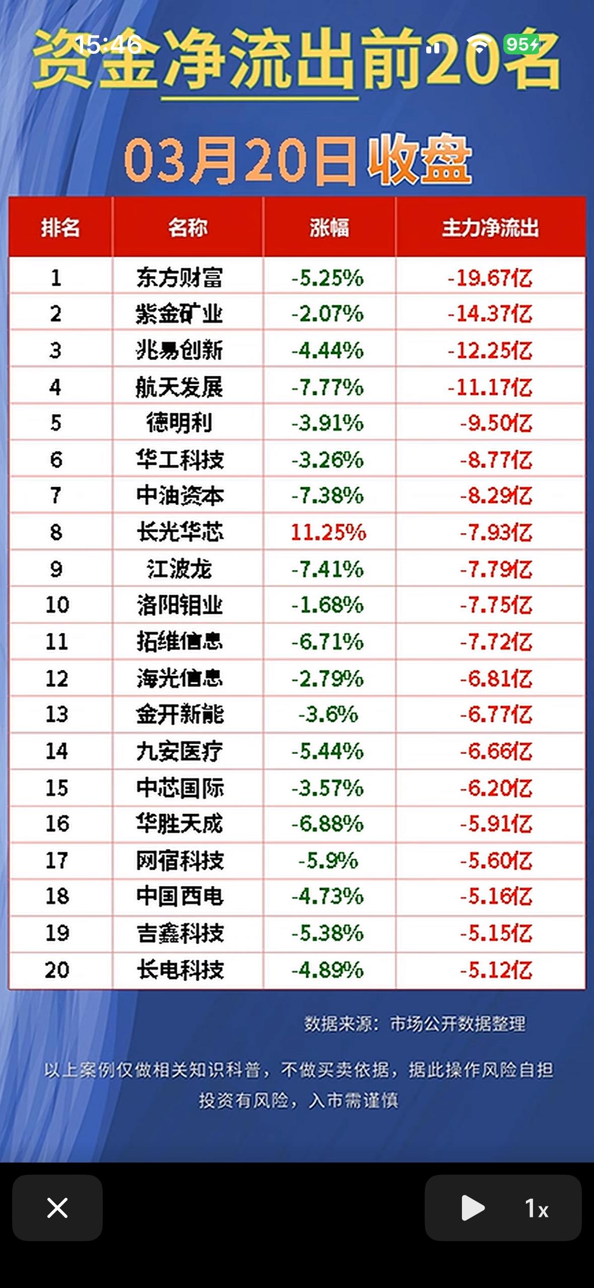 3月20日主力资金净流入与净流出前20名个股揭晓。 3月20日主力资金流向新鲜出炉,净流入与净流出前20名个股揭晓。这可太让人关注了,毕竟主力资金的动向往往能反映市场的偏好。 像净流入前20的个股,可能是被主力资金相中,有潜在的上涨机会。说不定背后是公司有新的业务拓展,或者行业前景被看好。而净流出前20的个股,就得小心了,也许是主力在撤离,公司可能面临一些问题。比如业绩不佳、行业竞争加剧等。股民们可得好好研究研究这些名单,说不定能从中找到投资的方向,不过投资有风险,还是得谨慎决策。
