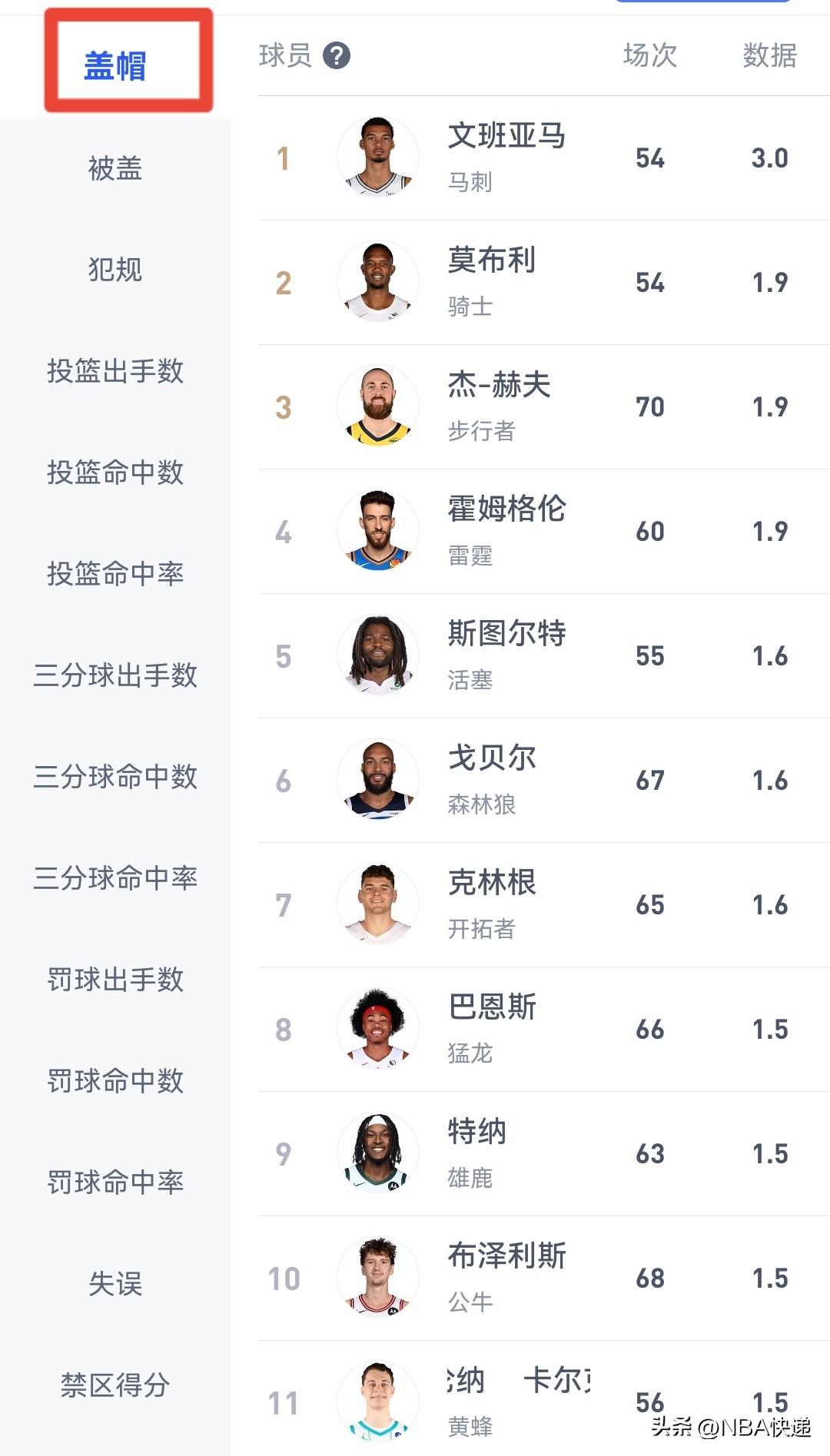 盖帽榜:文班亚马场均3次断档领先,第二至第四均只有1.9次,只要出战场次达到要求,文班盖帽王板上钉钉。