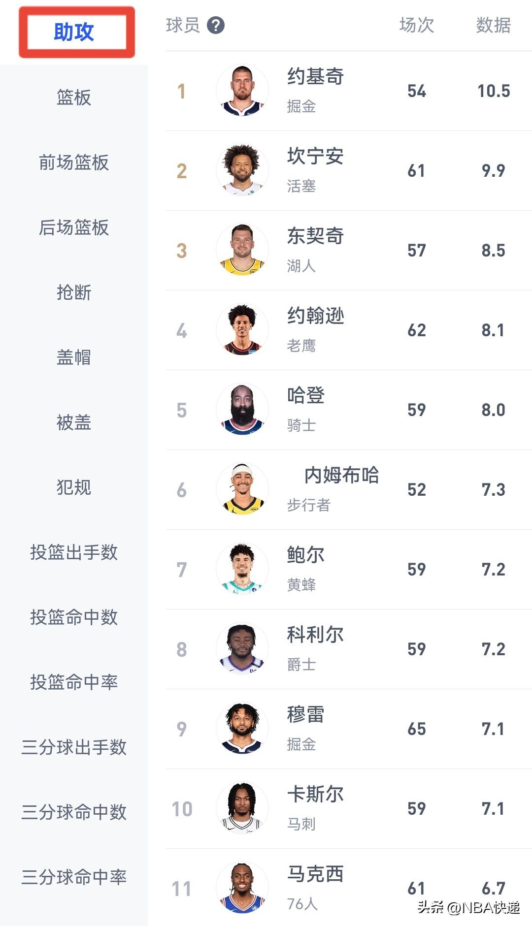 助攻榜:约基奇场次10.5次,第二名坎宁安场均9.9次(今日消息:坎宁安预计常规赛报销),第三名东契奇比约基奇少2次。