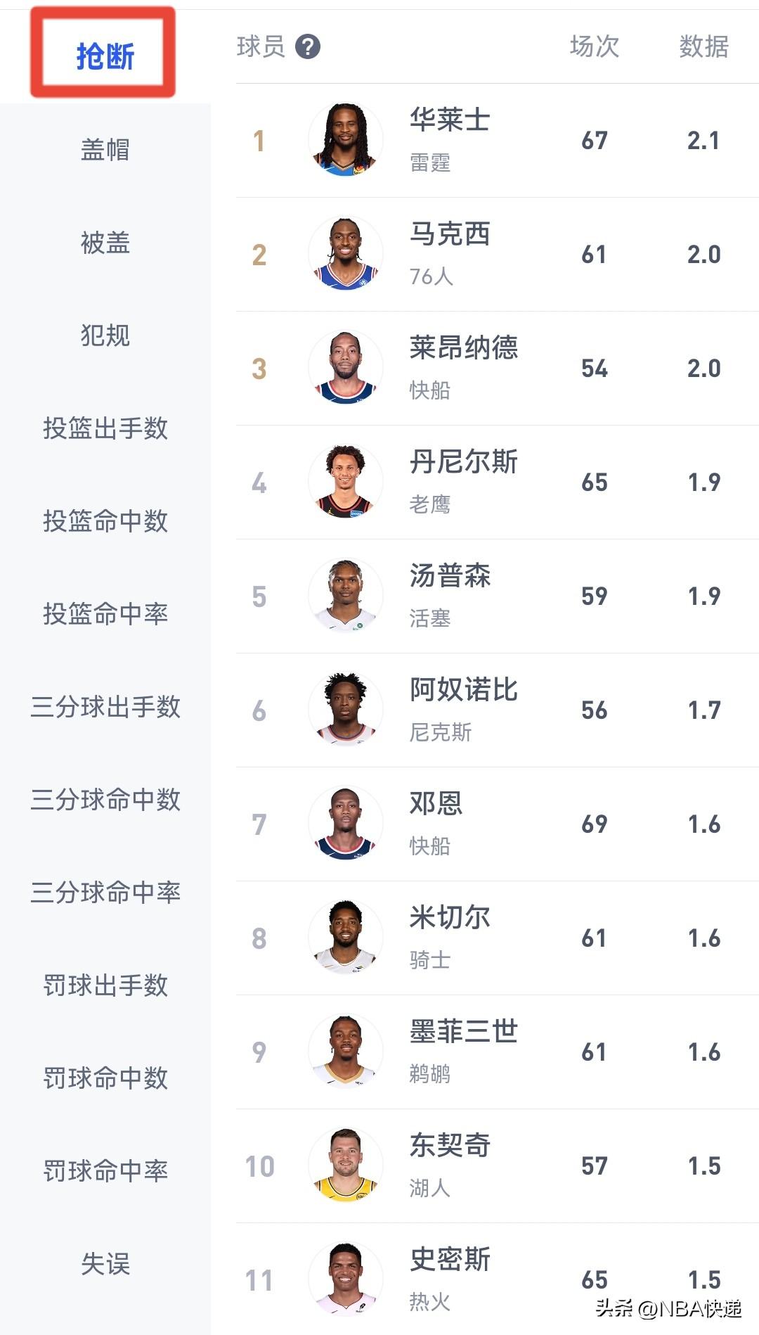 抢断榜:前三名场均只有0.1次的差距,不到赛季结束可能难分高下。