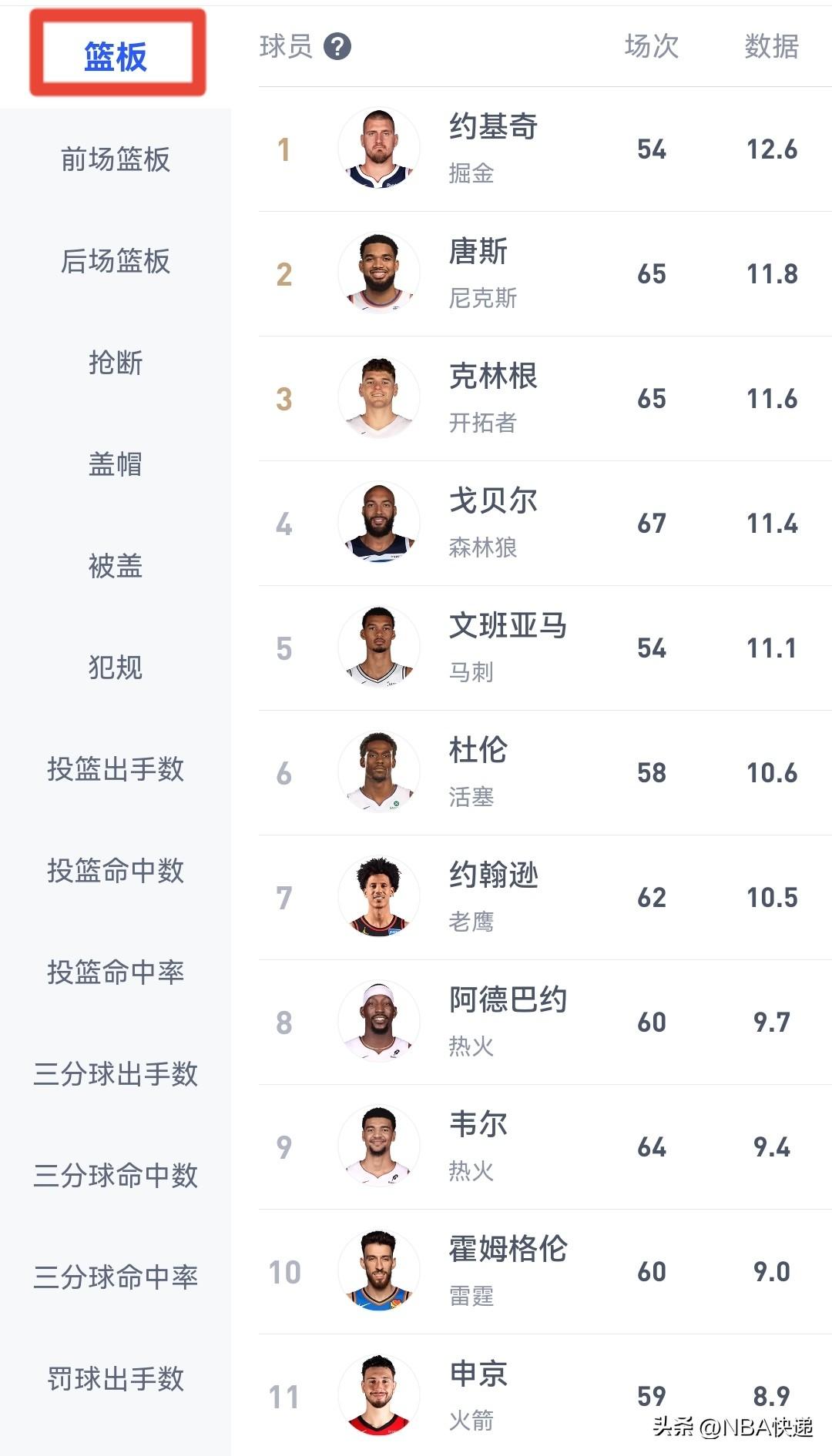 篮板榜:约基奇场均12.6个,领先第二名唐斯0.8个,克林根和戈贝尔分列第三第四。