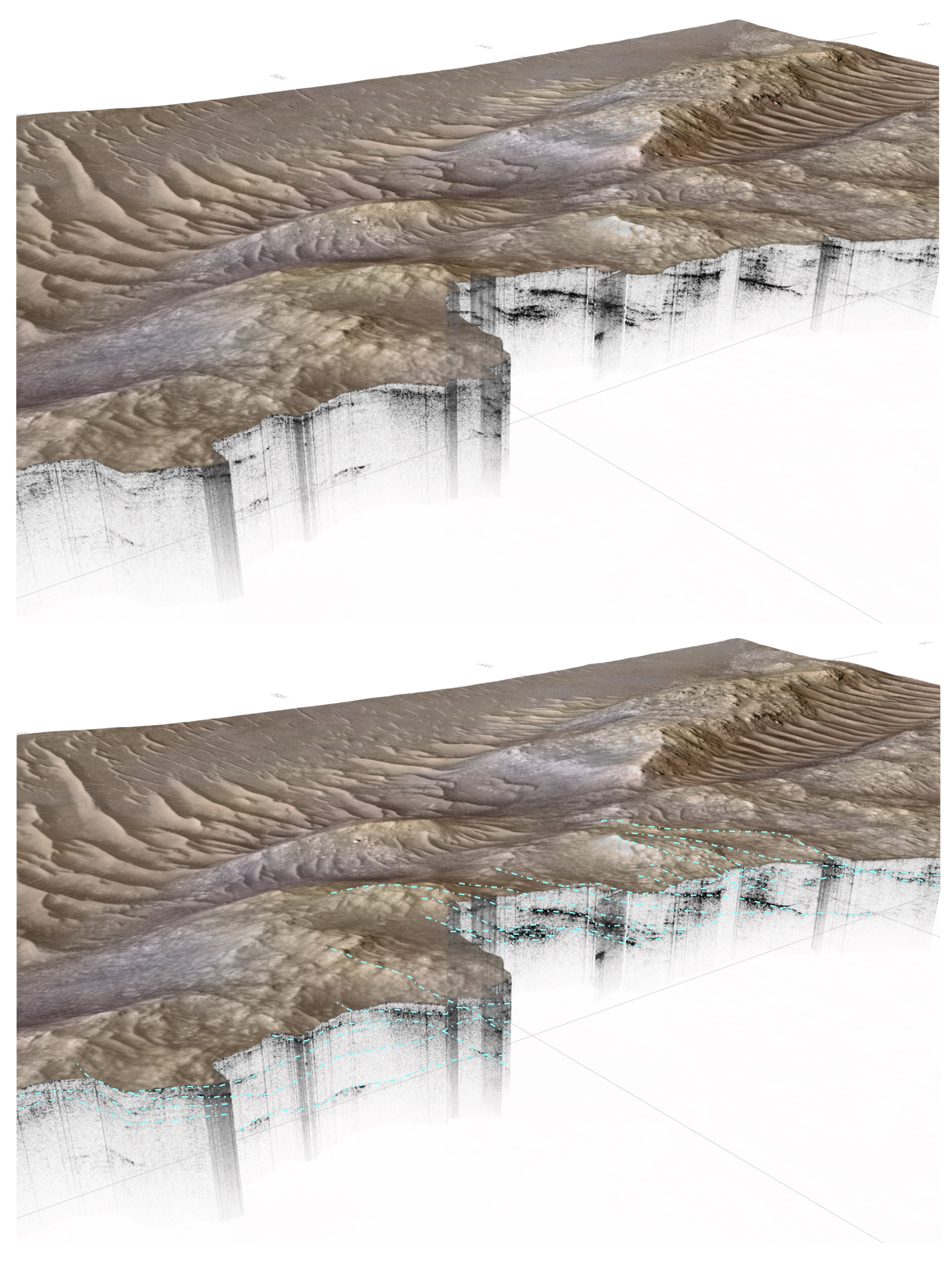 这张图片展示了科学家如何利用地质雷达数据(下方黑白图层)“透视”火星地表,并通过青色虚线将深达35米的地下古沉积层与现有的地表地貌精准对应,证实了该地区曾存在更为古老的河流三角洲。图源:NASA/JPL/UCLA/UiO/ETH Zurich