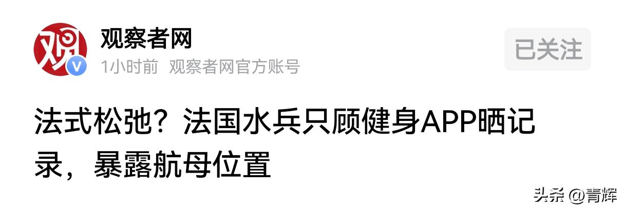 法国水兵:跑步才是正事,暴露航母坐标算什么! 法国已经把戴高乐号航空母舰派到了地中海执行任务,然而目前这艘航空母舰的具体位置甚至是具体到坐标的位置已经被曝光出来。有意思的事,这并不是哪一个国家的情报系统或者是卫星直接拍摄到的内容,而是法国军队自己公布的。只不过令人感到比较尴尬的,这并不是法国军队官方公布,而是一名法国士兵通过社交媒体公布出来,还是无意的! 根据世界报发布的消息可以得知,一名在戴高乐号航空母舰上服役的法国水兵在执行中东任务的时候,坚持在甲板上慢跑锻炼,这哥们在跑步的时候还随身携带了健身电子设备,直接把自己的坐标上传到了社交平台。由于他的社交帐号的个人资料属于公开内容,所以理论上来说,任何使用这个应用程序的人都可以直接查阅到此人具体的位置。也就是说,这个人现在在哪里戴高乐号就在哪里。 这简直是匪夷所思,法国航空母舰这次执行的并不是军事演习,而是实打实的军事任务。很难想象参与一线作战的人员,居然还可以正常的使用社交平台,甚至可以以一种无意识的状态把核心的一些信息发布出去。并且这种情况在法国军队中出现了已经不止一次了。 从这种事件中我们至少能够看到法国军队确实存在着军纪问题。连这种最基本的防泄露准则,都无法有效的贯彻下去。甚至不排除他们的一些一线作战人员,连最基本的保密措施都不怎么在乎。 航母算啥?坚持跑步锻炼身体才是自己的[看]