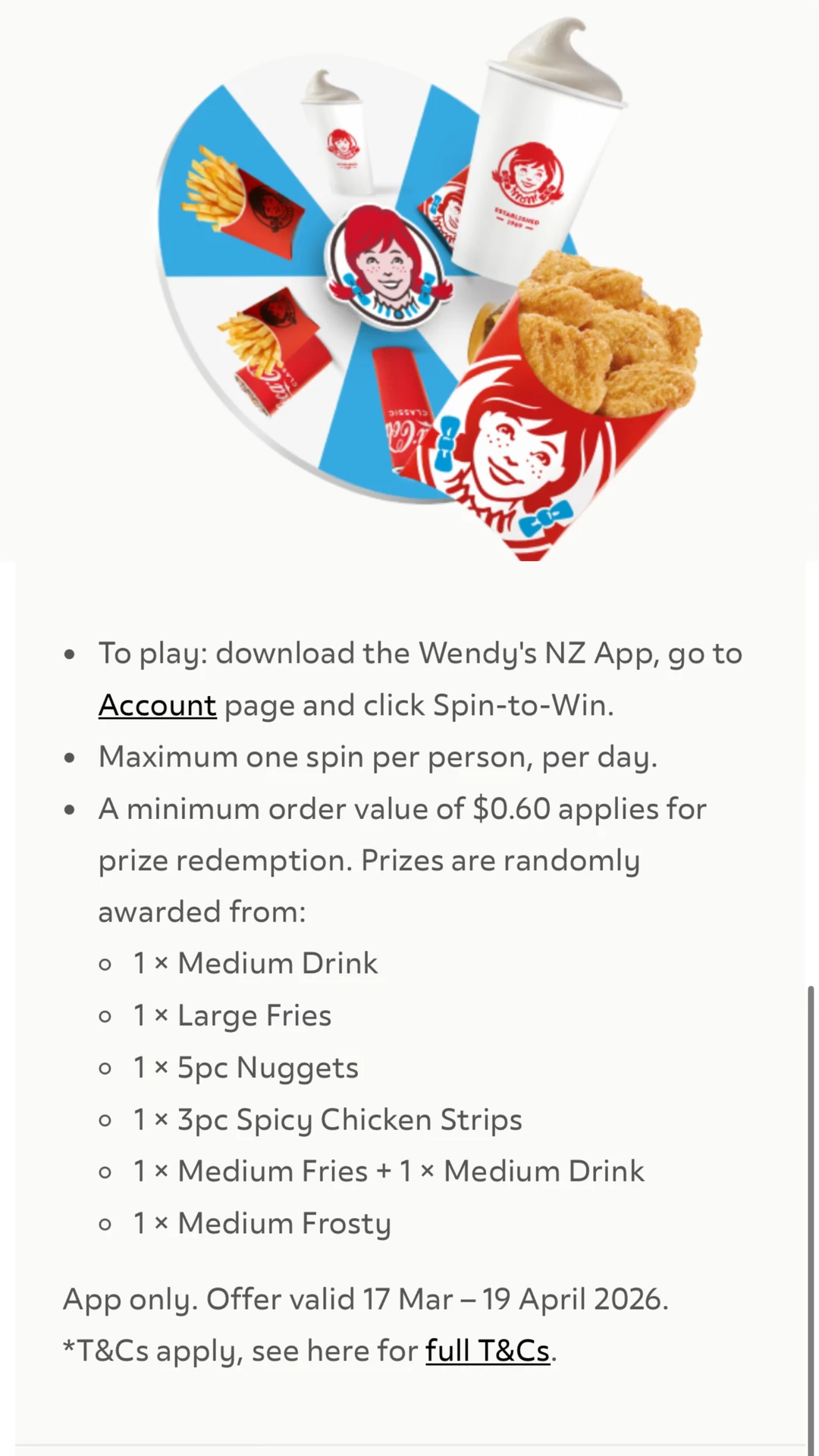 Wendy's这波🐏必须薅!每天抽转盘就能抽中免费吃喝[黄金薯R][黄金薯R] [拔草R]操作如下: 线上打开Wendy's 在「Accounts」页面点「Spin-to-Win」就能抽免费餐品! 奖品池超丰富: ✅ 中杯饮料 ✅ 大份薯条 ✅ 5块 nugget ✅ 3块香辣鸡柳 ✅ 中薯+中杯饮料套餐 ✅ 中杯Frosty ⚠️ 兑换规则: • 最低消费$0.6就能用奖品 • 每天都能抽一次![暗中观察R][暗中观察R] 0.6刀就能解锁免费小食,四舍五入等于不要钱!太香了!快去抽 解锁你的小吃盲盒吧[鼓掌R][鼓掌R] 关注我,下一篇更精彩