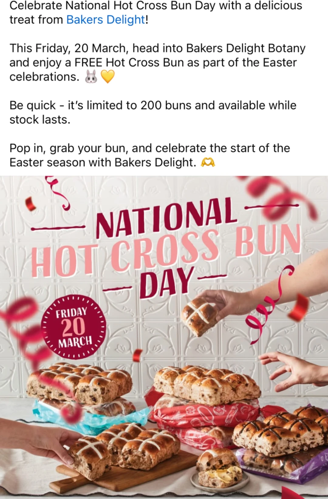 Botany Town Centre的Bakers Delight本周五(3月20日)要搞复活节活动啦啦🎉 为了庆祝National Hot Cross Bun Day,他们免费送十字面包!🍞✨ 只要在当天去店里,就能领到一个热乎乎的Hot Cross Bun🔥 不过只有200个,送完即止,手速要快🏃♀️💨 复活节气氛组已就位,冲一波甜甜的小面包,开启节日好心情吧🥳🎄 📍Bakers Delight Botany 📅3月20日(周五) 🎁限200个,送完为止 关注我,下一篇更精彩
