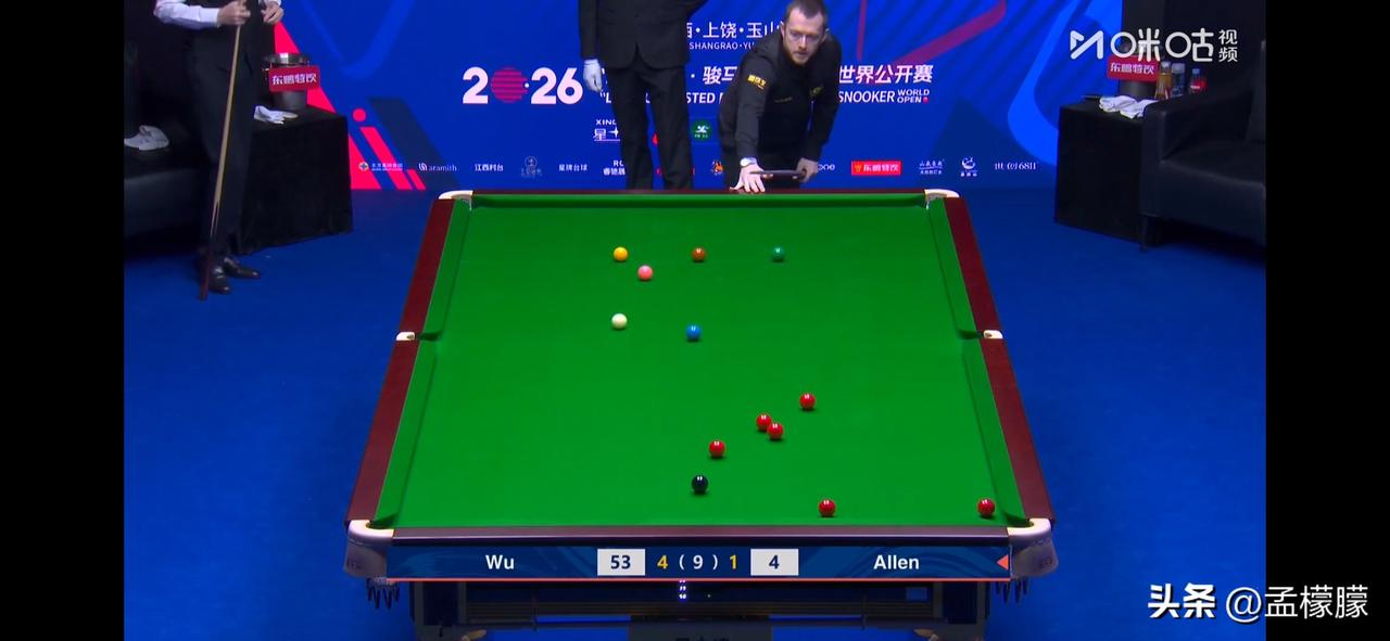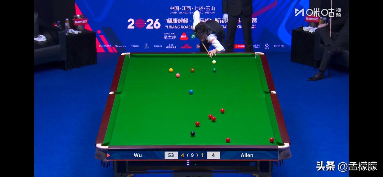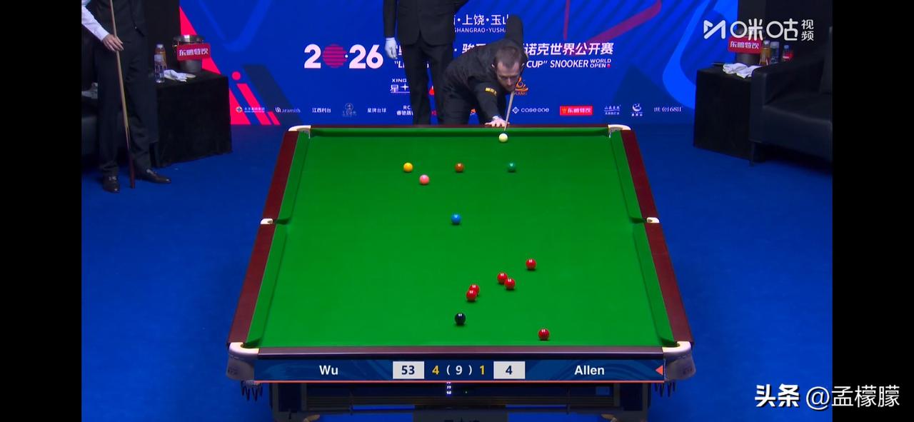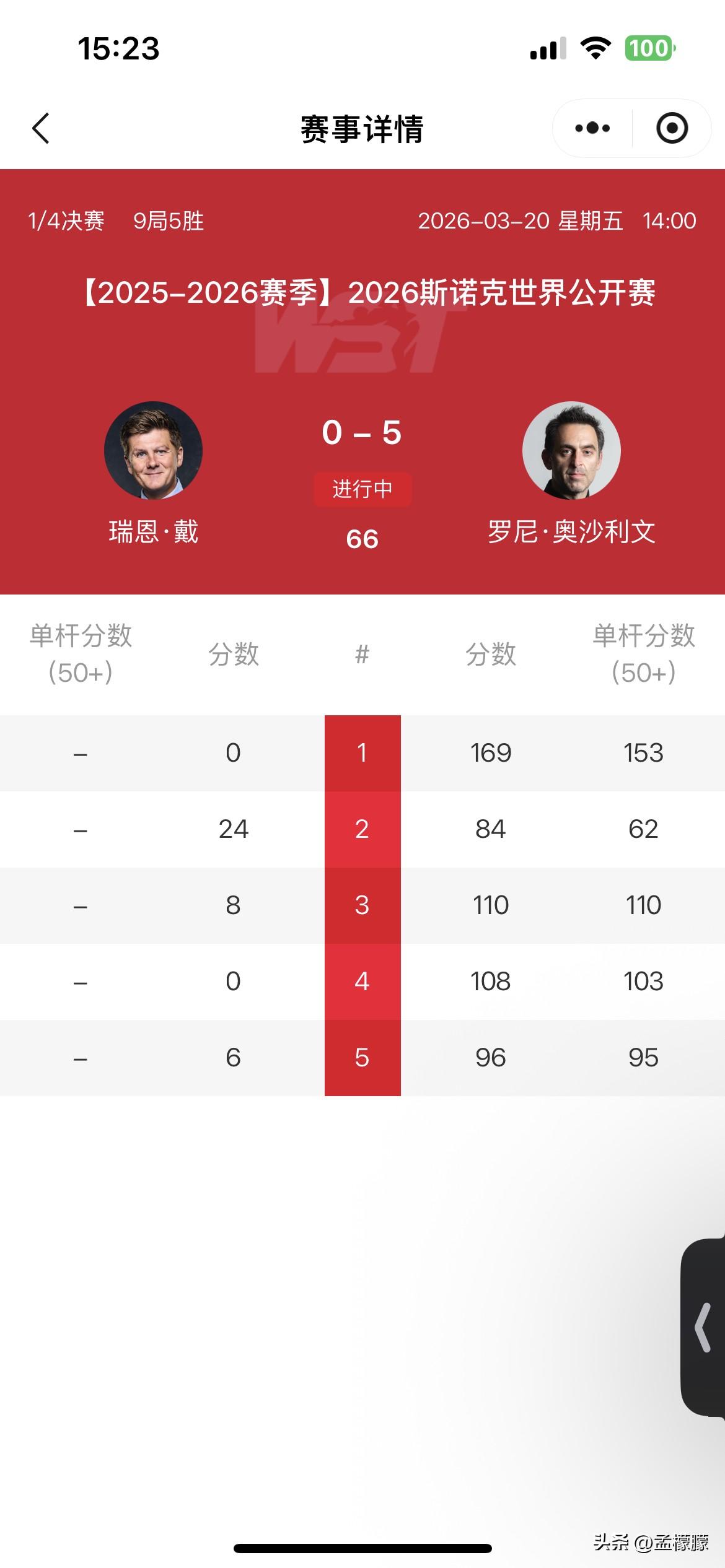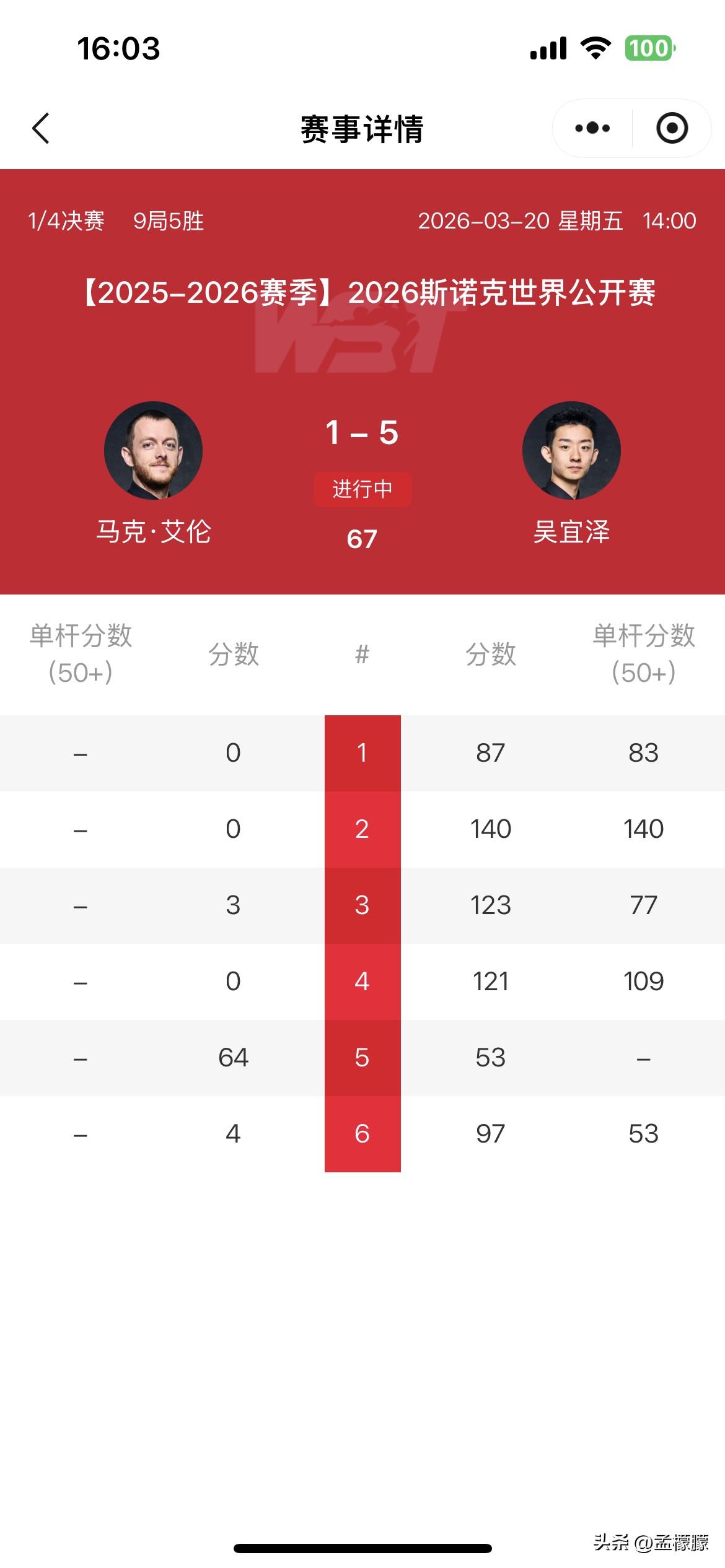 2026斯诺克世界公开赛|153!火箭打破出尘封22年的历史单杆最高纪录,5-0战胜瑞恩·戴;吴宜泽5-1力克劲敌艾伦,晋级4强 北京时间3月20日14:30,2026中国江西•玉山斯诺克世界公开赛正赛第5天8进4轮次场次比赛开始进行。 火箭奥沙利文 在与瑞恩·戴的第一局比赛中,瑞恩·戴一杆白球摔袋,罚四分,然后奥沙利文 一杆斯诺克,罚了瑞恩·戴12分,火箭获得自由球,火箭绿球當红球打,顺利叫到黑球,最后清台打出单杆最高153分。火箭打破尘封22年的历史单杆最高纪录。这局总分169。 上一次148最高分还是2004英锦赛杰米·伯内特打出的。 下午另一场比赛,中国后起之秀、世界排名第11位的吴宜泽对阵世界排名15的艾伦,吴宜泽5-1战胜艾伦,晋级四强。赛后两人玩起了手表。 半决赛将对阵强敌火箭。 2026斯诺克世界公开赛斯诺克 一起聊聊斯诺克 探讨斯诺克 吐槽个球 斯诺克世界公开赛斯诺克热评