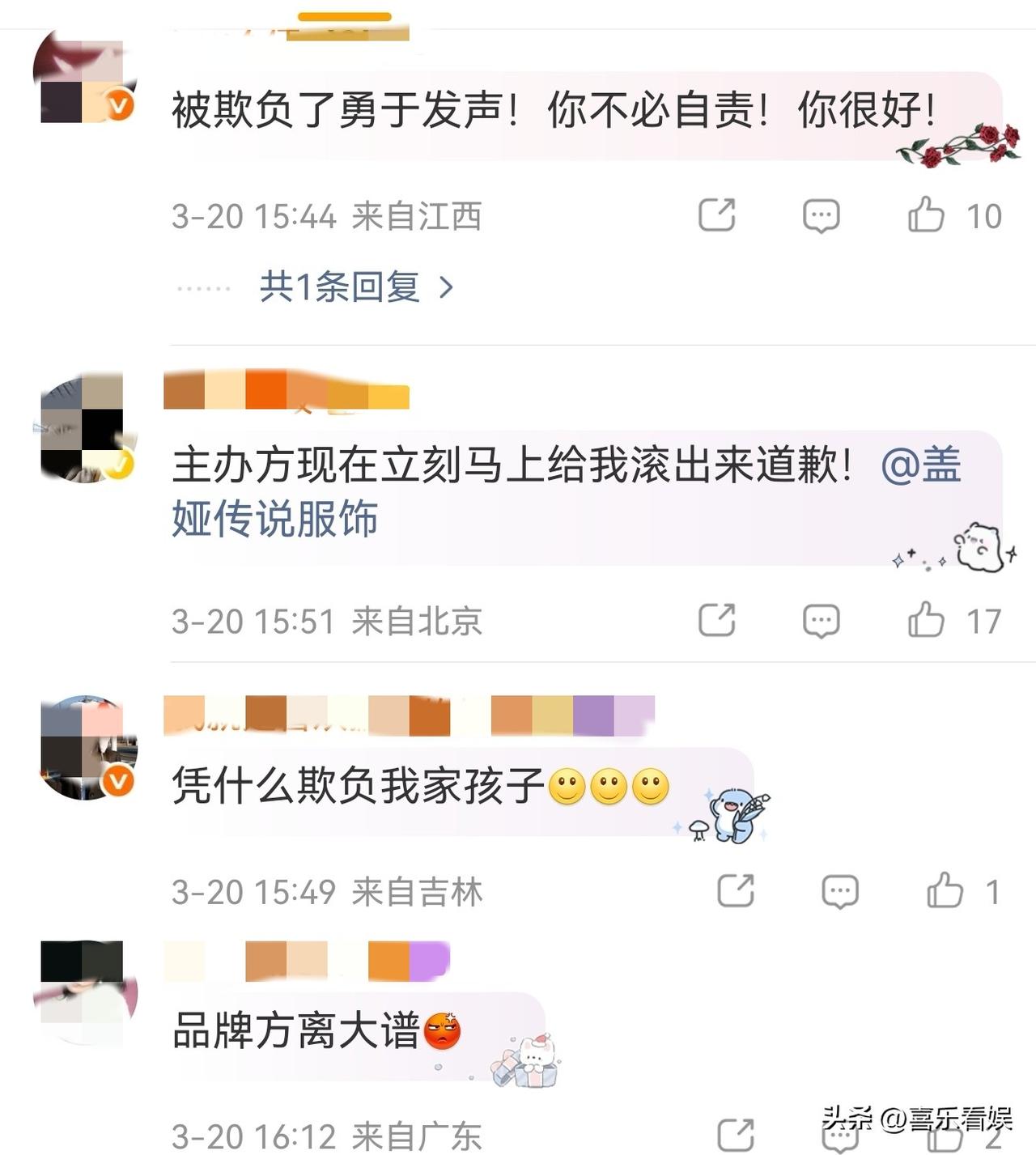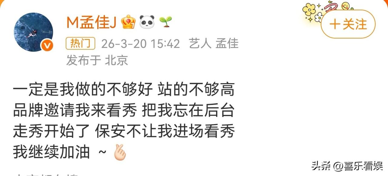 孟佳,高调发文 3月20日下午,女星孟佳因为一件离谱事冲上热搜了,看的粉丝网友气愤不已。 原来,孟佳在社交平台上,高调发文吐槽,说自己被品牌方邀请来看秀,结果居然被忘在后台了。 更让人无语的是,等走秀都开始了,保安还把她拦在门外,根本不让进场看秀。 光看文字都觉得尴尬,更别说当事人孟佳了,换谁遇到这种事都得懵。 被品牌方这样对待,孟佳表示“一定是我做的不够好,站的不够高”,看完真的让人心疼。 明明是品牌方邀请来的,结果安排得一团糟。 网友们看完也都气坏了,评论区全是替孟佳抱不平的声音。 有人直接喊“被欺负了勇于发声!你不必自责!你很好!”,还有人怒怼主办方“立刻马上给我滚出来道歉!”。 大家都觉得品牌方这操作也太离谱了,邀请人来又不好好安排,完全不尊重艺人。 还有粉丝心疼说“凭什么欺负我家孩子”,也有网友吐槽品牌方太没分寸,办活动连基本的接待都做不好。 其实孟佳一直都很敬业,不管是舞台还是工作都特别认真。 不管怎么样,希望孟佳能等到品牌方给她一个说法。 对此,你们怎么看?