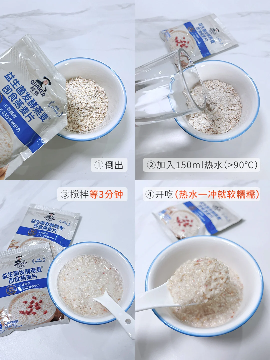 对我来说,它的便利性很打动人。每袋40克,作为一餐的主食分量刚好。早晨时间紧,热水冲泡,搅拌均匀,3分钟左右,软软糯糯酸酸甜甜的一碗燕麦🥣就好了。如果想换换口味,加些牛奶🥛用微波炉加热一两分钟,奶香混合着谷物的香气,口感会更加醇厚。