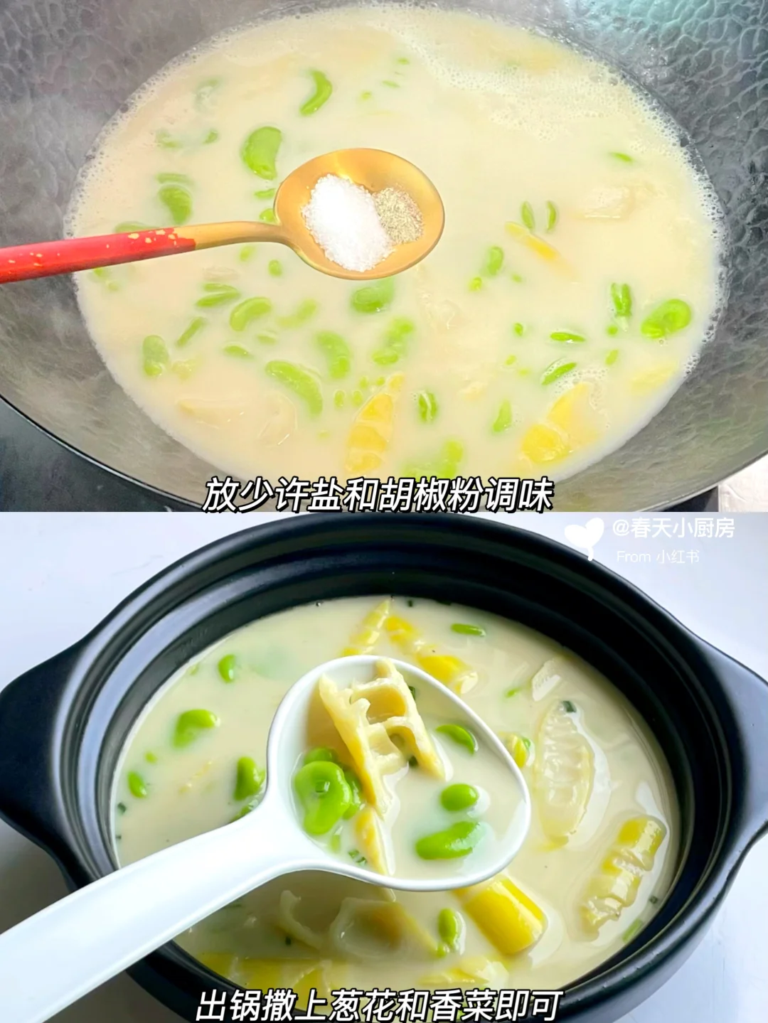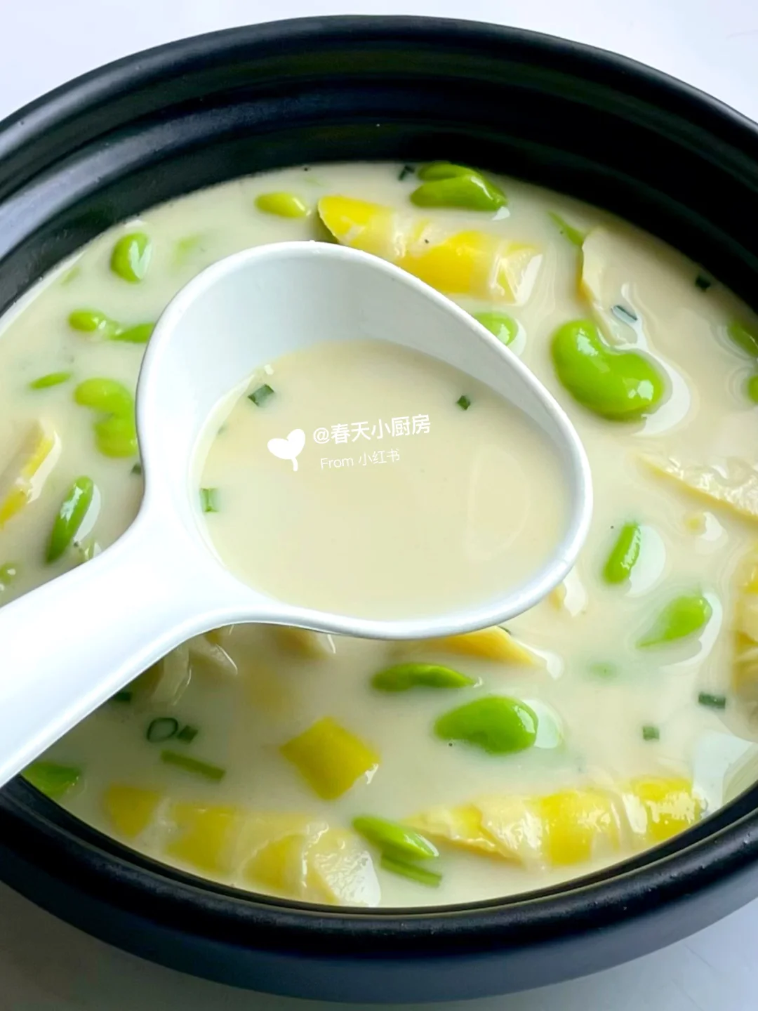 我家的春天真好吃 🌈🌈谁懂啊!春天的鲜都在这碗汤里了✨ 鲫鱼+春笋+蚕豆 神仙组合 奶白浓汤 鲜到舔盘! 做法巨简单 厨房小白也零失败 🌿🌿食材 鲫鱼两条(中等大小) 春笋、新鲜蚕豆 葱花、姜片、香菜 盐、白胡椒粉、食用油、开水 🔍🔍做法见图四图五图六 真的巨鲜巨清甜🌱 春笋脆嫩 蚕豆软糯 鱼汤奶白不腥 汤喝起来完全不腻 一口下去全是春天的味道 减脂期也能放心喝 低卡高蛋白 鲜美又养胃 全家都爱喝! 快抓住春天的尾巴安排上~