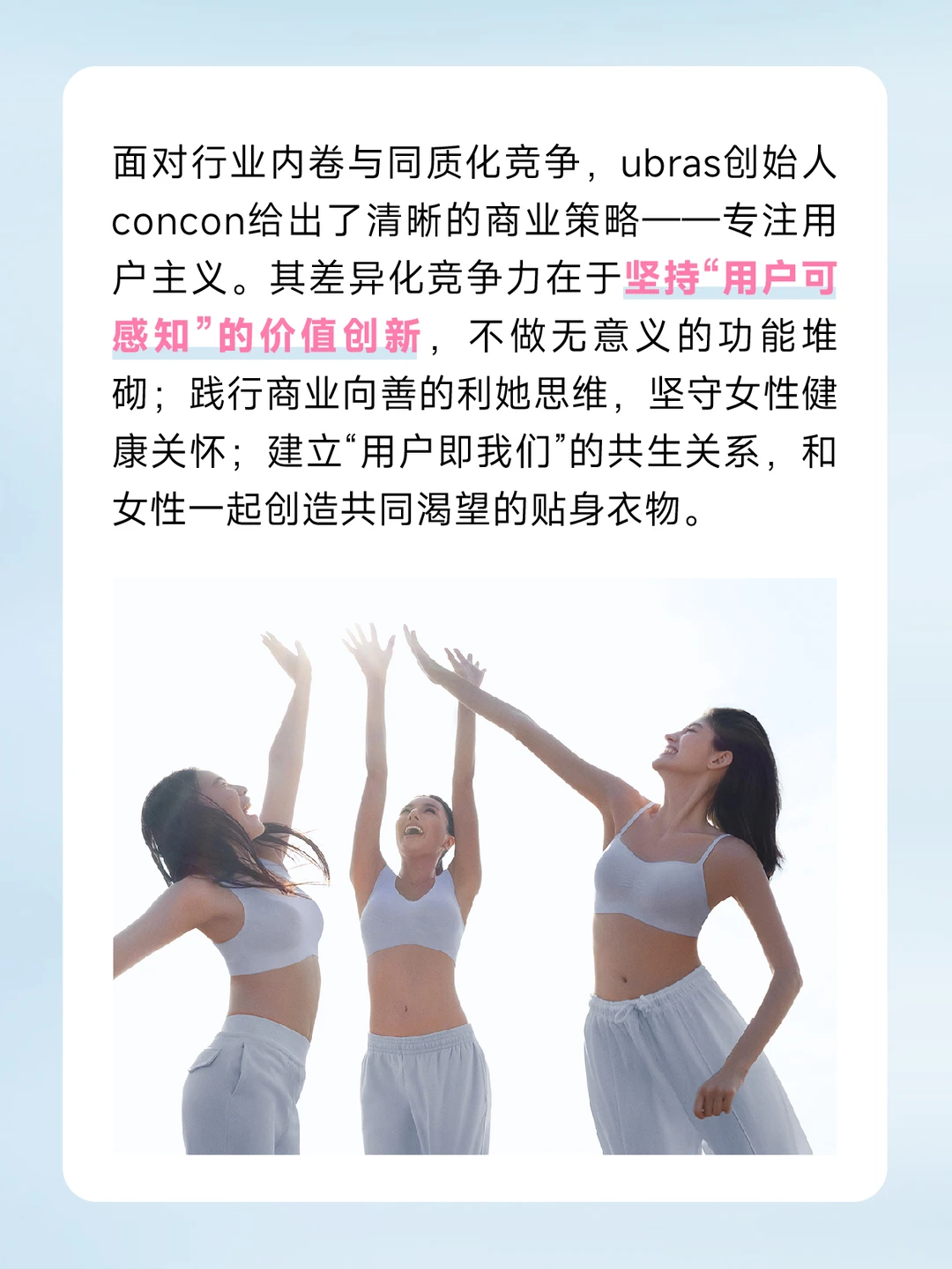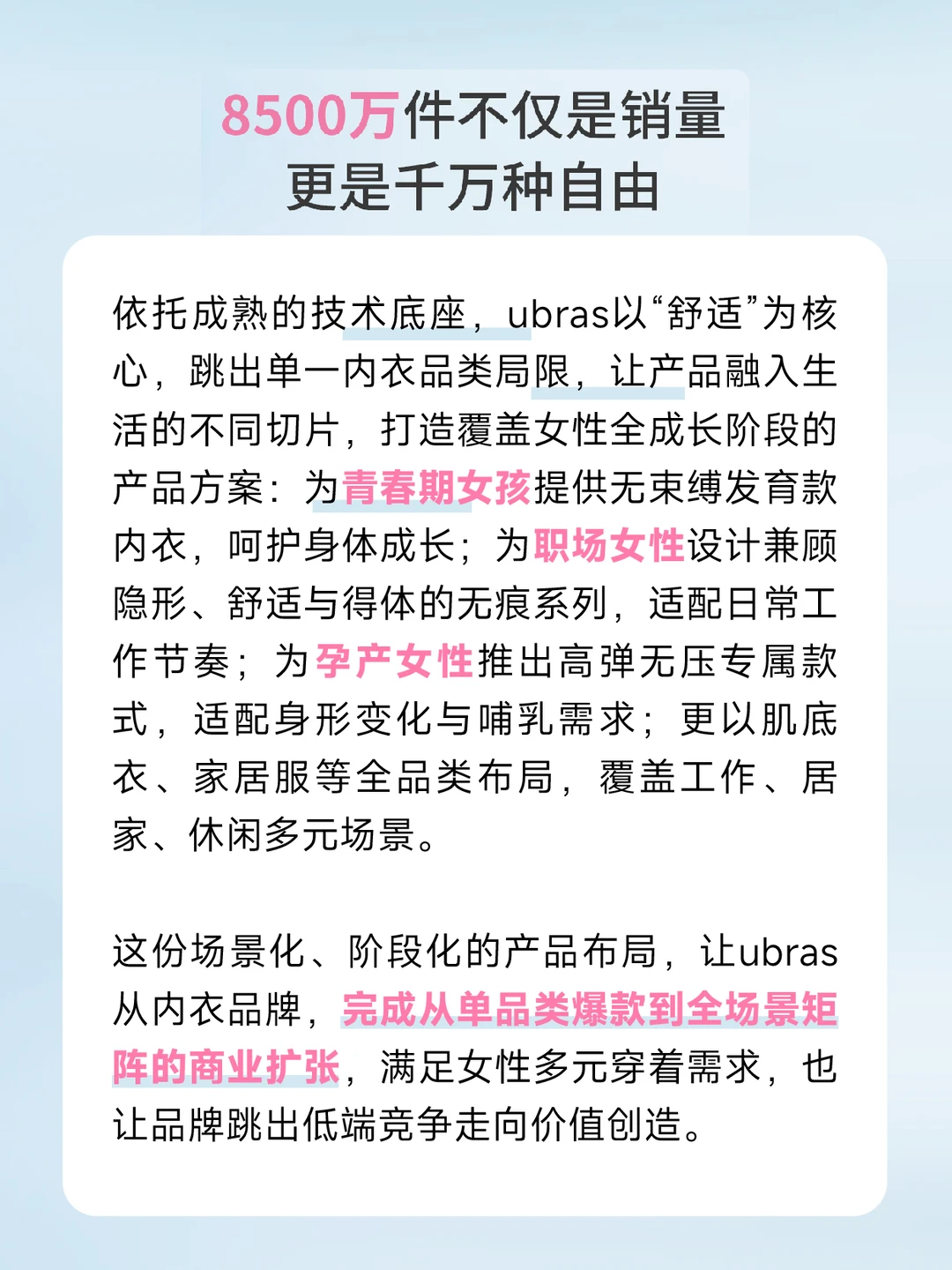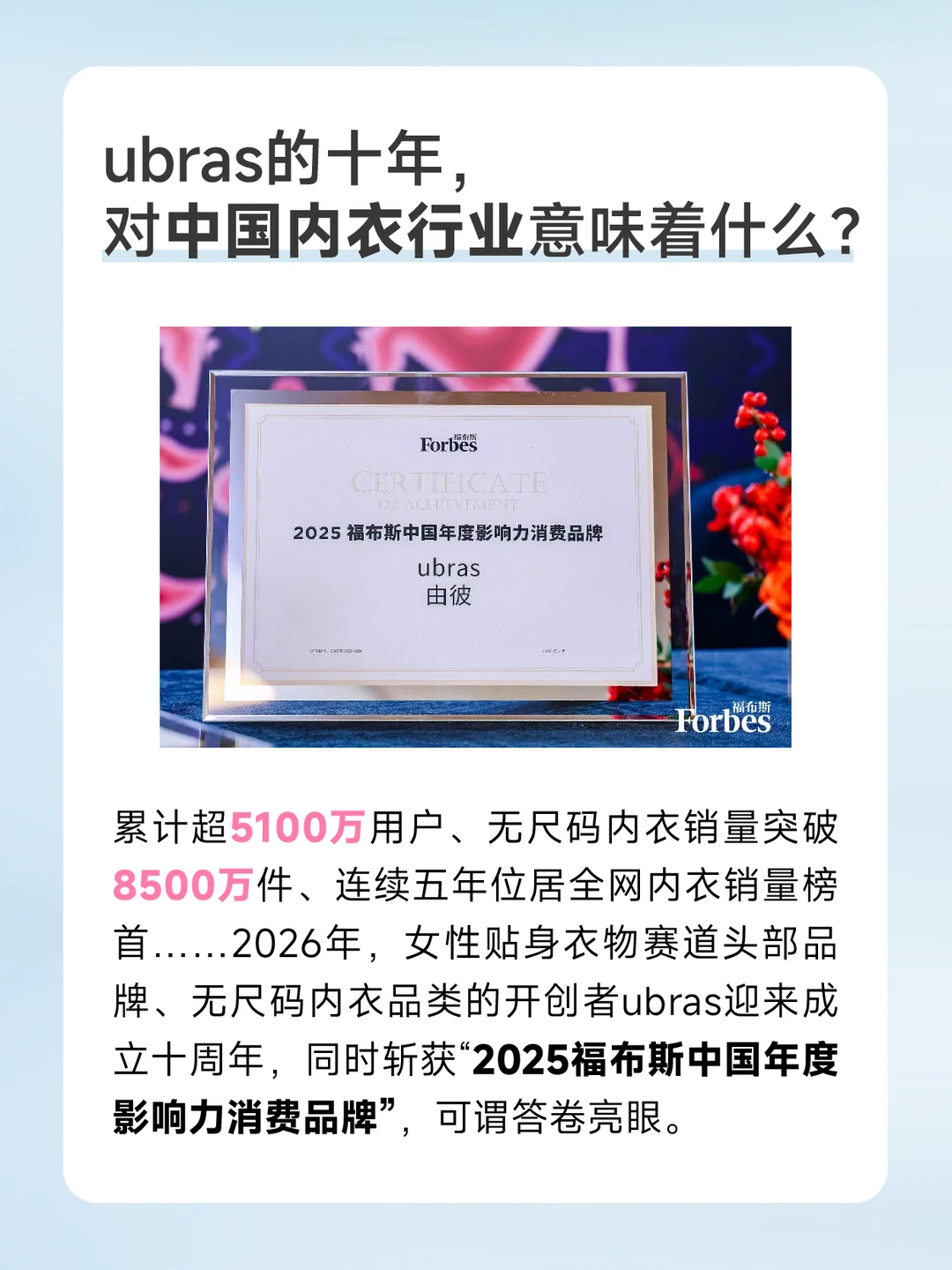 [举手R]过去十年间ubras持续领跑中国女性贴身衣物赛道,累计超5100万用户、无尺码内衣销量突破8500万件、连续五年位居全网内衣销量榜首,同时斩获“2025福布斯中国年度影响力消费品牌”。[点赞R][点赞R]