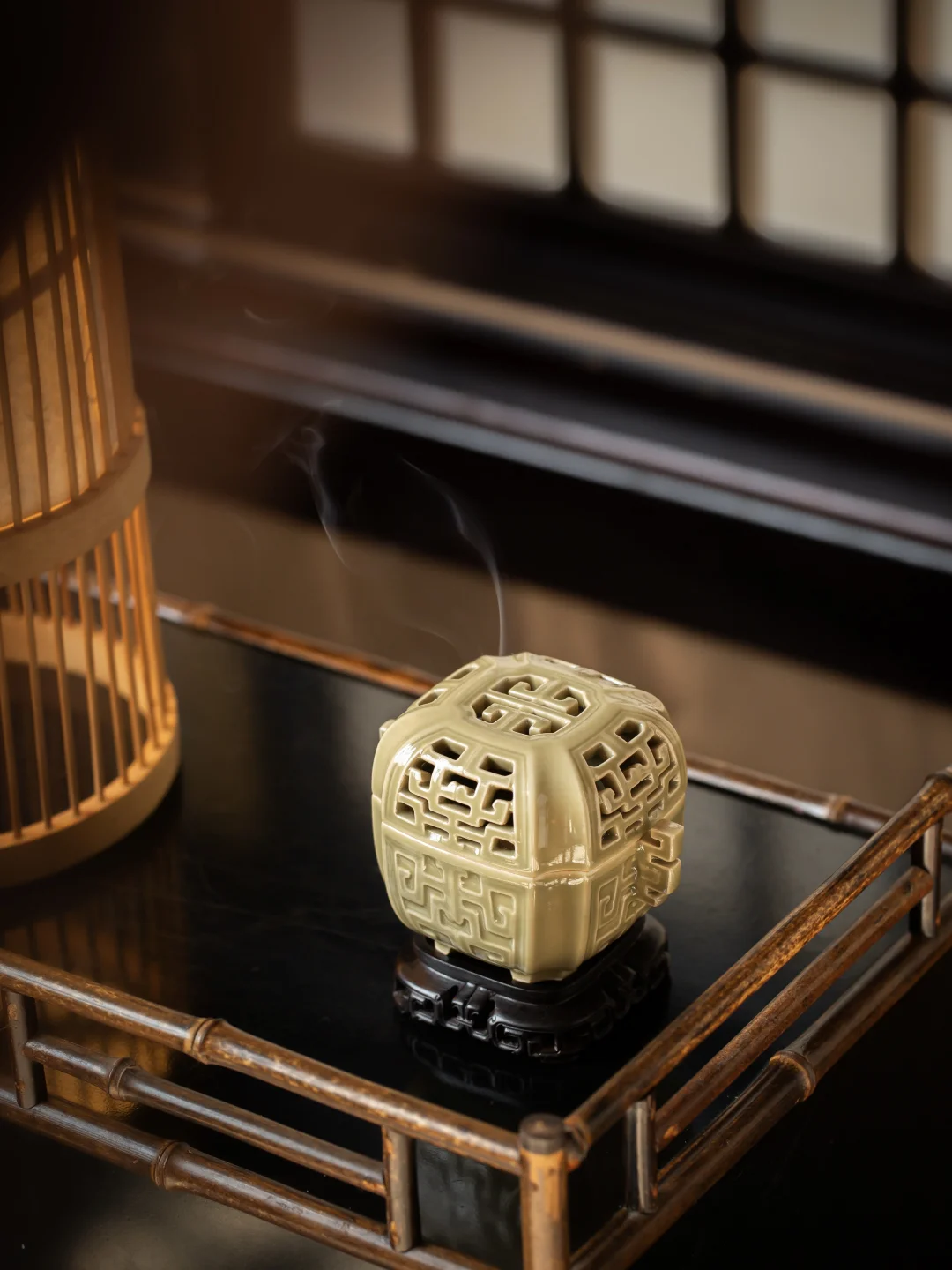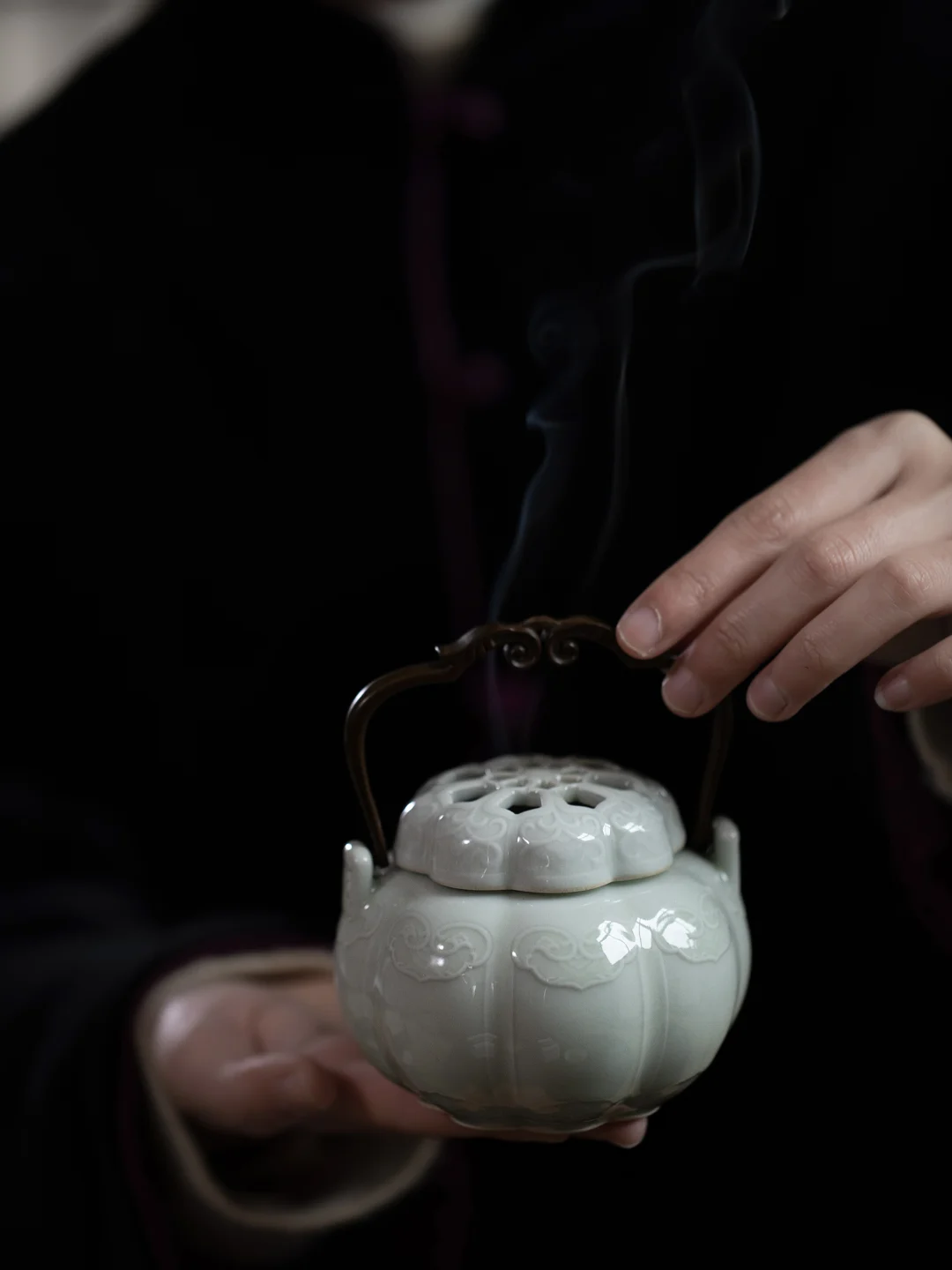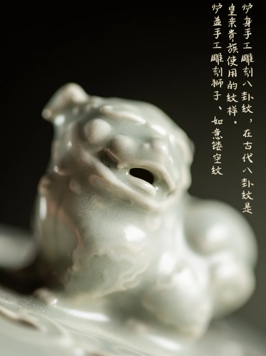 明代龙泉窑的经典,狮子蹲在炉盖上,脚下是镂空的如意纹。八卦纹刻在炉身,是皇亲贵族用过的样式。庄严,却不沉闷。点一炉香,烟从如意纹里散出来,狮子便在云雾里若隐若现。